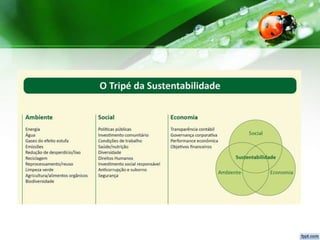 O documento discute o conceito de sustentabilidade, definindo-o como um ideal que busca equilíbrio entre desenvolvimento econômico e preservação ambiental. Apresenta o uso de biocombustíveis no Brasil como exemplo e descreve os três pilares da sustentabilidade: social, econômico e ambiental. Finaliza afirmando que a sustentabilidade requer cuidado com as pessoas, compartilhamento de riquezas e preservação do meio ambiente.