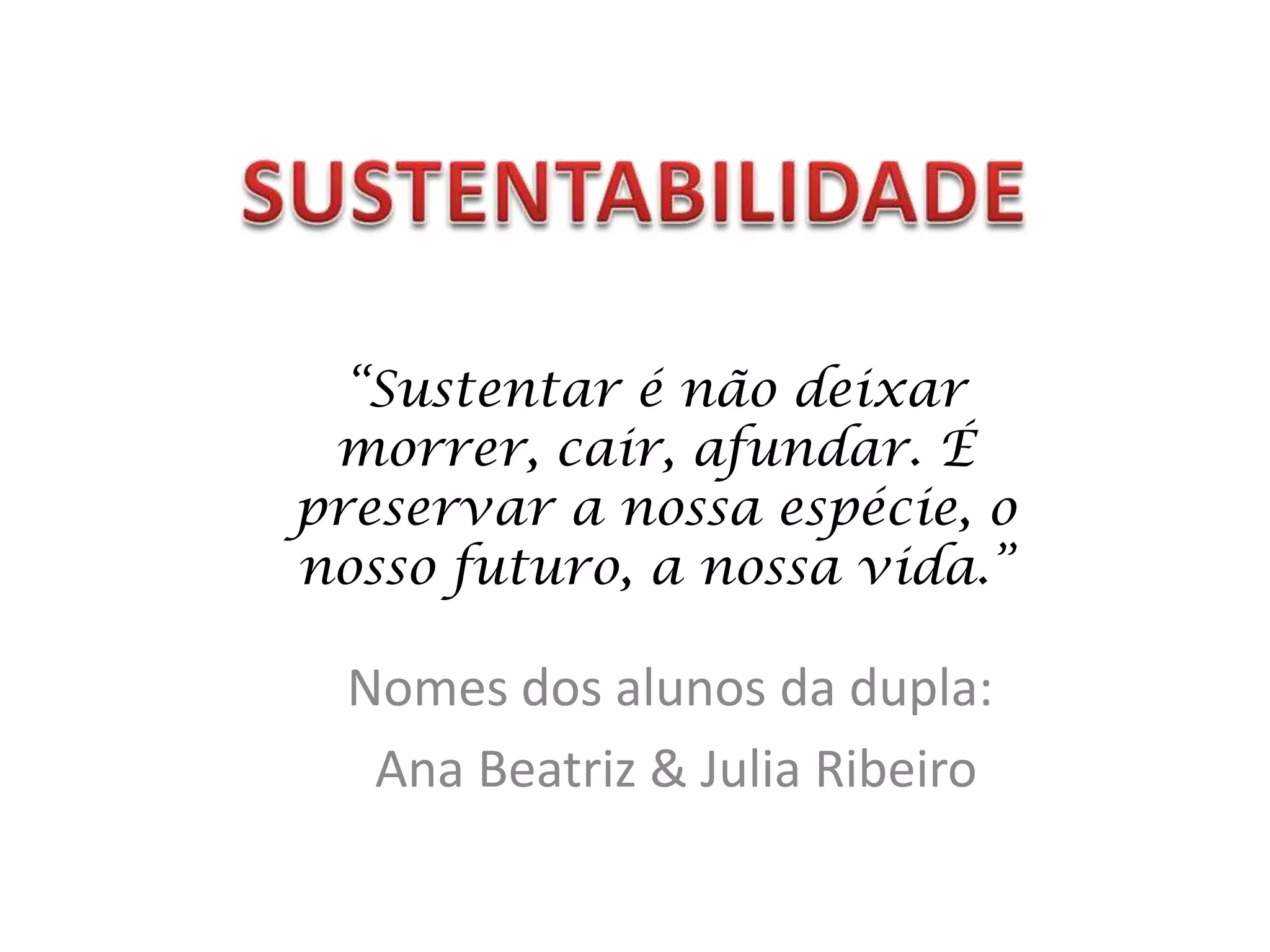 O documento define sustentabilidade como a habilidade de sustentar ou suportar condições para permitir a permanência de um processo ou sistema no longo prazo. Ele também discute desenvolvimento sustentável como satisfazer as necessidades atuais sem comprometer as gerações futuras e fornece exemplos de como seria uma cidade ou vida sustentável.