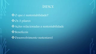 O documento discute a sustentabilidade, definindo-a como ações que atendem às necessidades atuais sem comprometer o futuro. Ele explica os três pilares da sustentabilidade - social, econômico e ambiental - e dá exemplos de ações relacionadas e benefícios, concluindo que o desenvolvimento sustentável busca o crescimento econômico equilibrado com o social e a preservação ambiental.