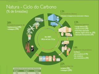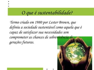 O documento discute a sustentabilidade na indústria de cosméticos, definindo termos como sustentabilidade e desenvolvimento sustentável. Ele também descreve os principais impactos ambientais do setor e as ações tomadas por empresas como Natura e O Boticário para promover a sustentabilidade, como reduzir o uso de recursos naturais e embalagens, tratar efluentes e realizar projetos sociais e ambientais.