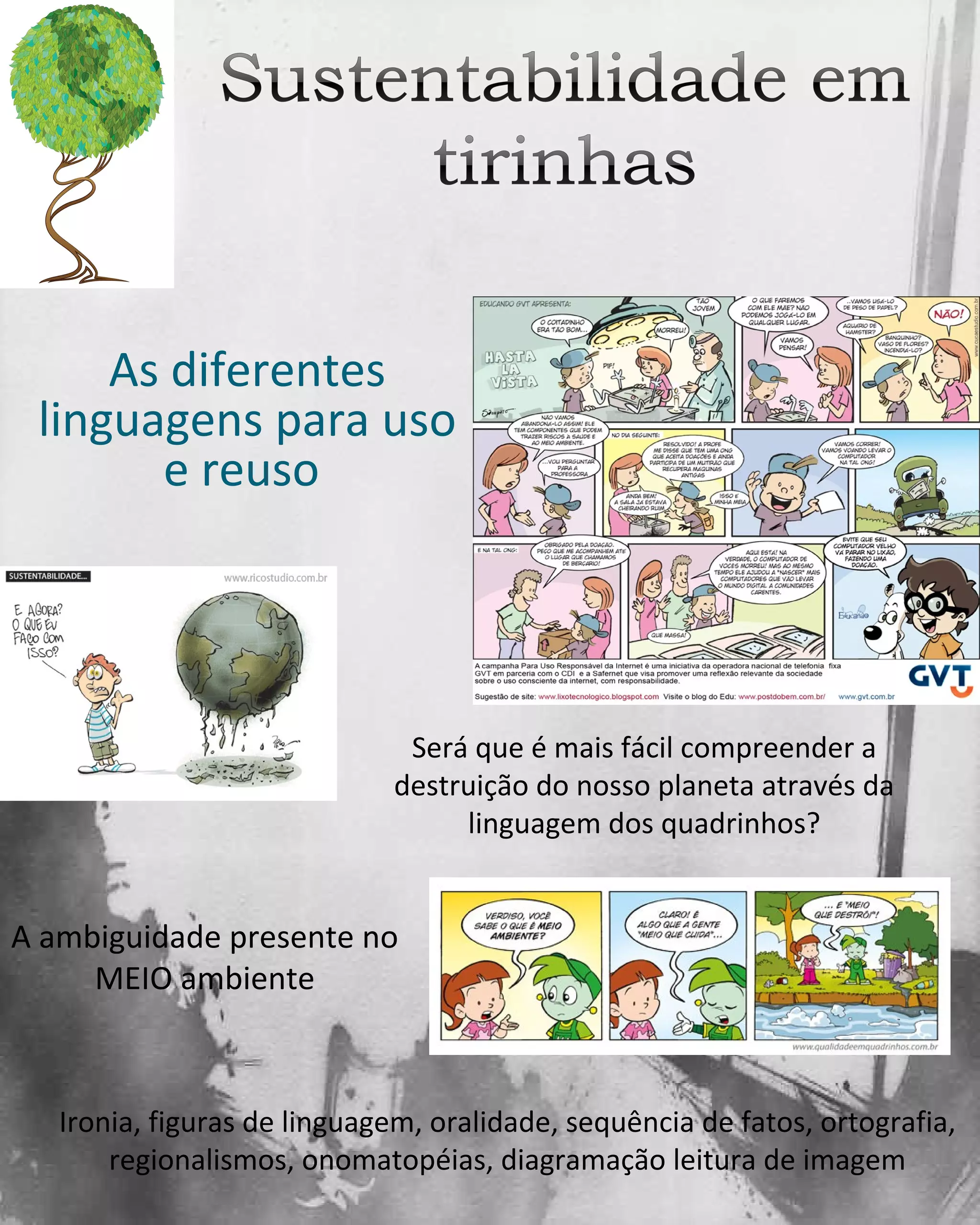 O documento discute como a linguagem dos quadrinhos pode ser usada para comunicar sobre questões ambientais de forma mais acessível, mencionando que ironia, figuras de linguagem, oralidade e outras características dos quadrinhos podem facilitar a compreensão da destruição do planeta.