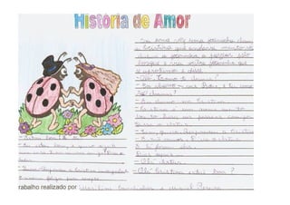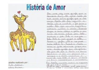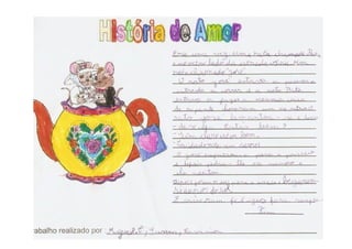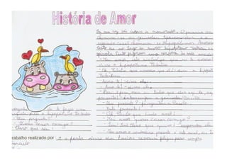 O documento descreve atividades em que estudantes produzem histórias românticas e cartões de amizade para crianças de pré-escola com base em imagens e jogos. Os estudantes compartilham suas histórias com colegas e escrevem mensagens de amizade em corações para as crianças.