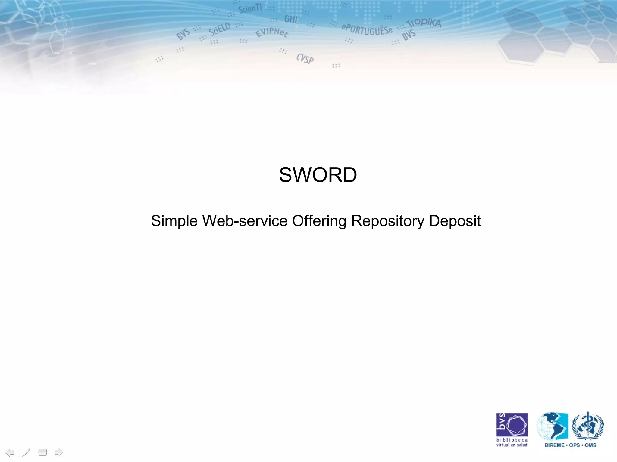 O documento descreve o protocolo SWORD (Simple Web-service Offering Repository Deposit), que permite o depósito remoto de conteúdo em repositórios abertos através de uma interface web service. O SWORD é usado por universidades e instituições de pesquisa para compartilhar saídas de pesquisa como vídeos, dados de experimentos, livros e artigos.