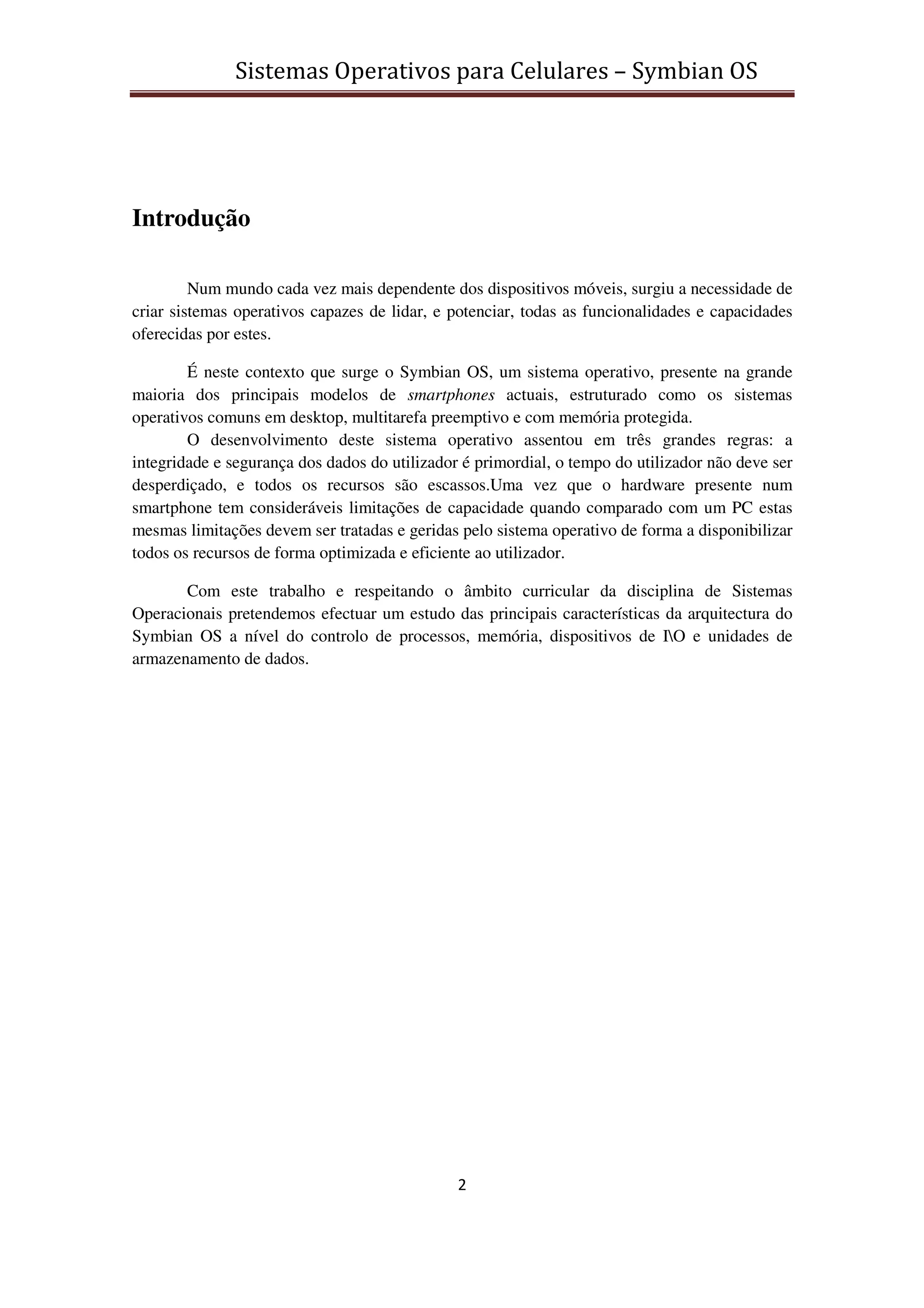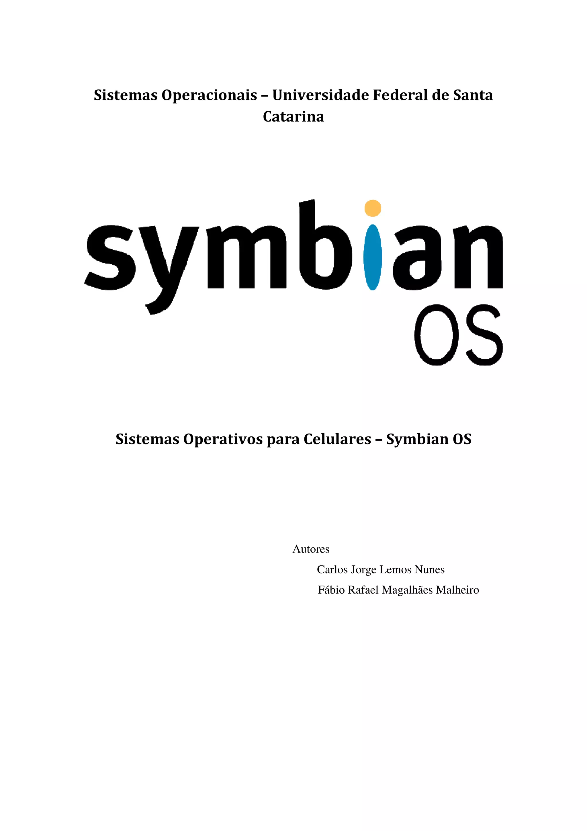 O documento descreve o sistema operativo Symbian OS, focando-se na sua arquitetura de núcleo, gestão de processos, memória e entrada/saída. Discutem-se as características do núcleo EKA e como ele implementa processos, threads, alocação de memória e comunicação com dispositivos.