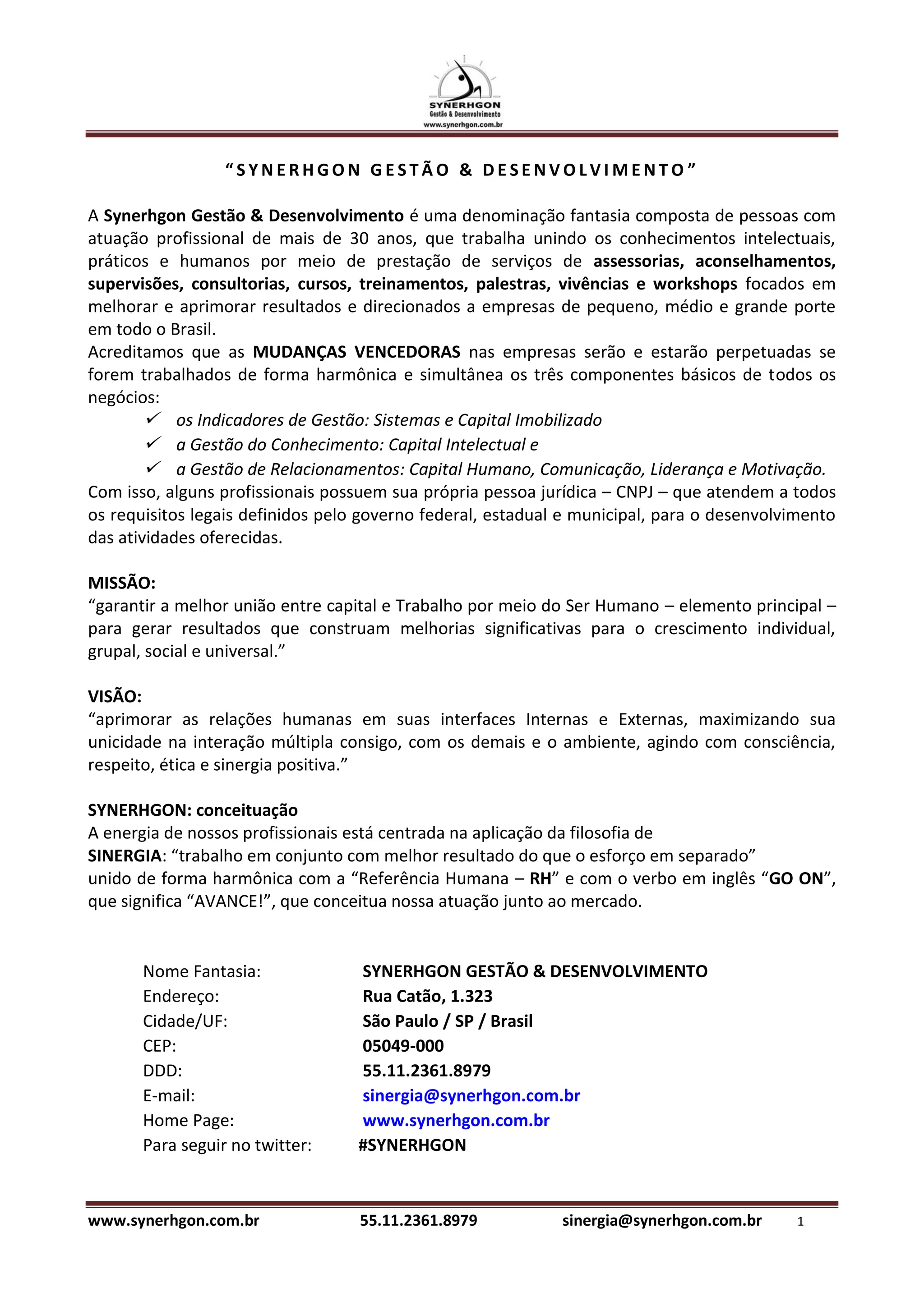 A Synerhgon Gestão & Desenvolvimento é uma empresa com mais de 30 anos de experiência que oferece serviços de consultoria e capacitação voltados para melhorar resultados de empresas de diversos portes no Brasil. A missão da empresa é unir capital e trabalho por meio do ser humano, enquanto sua visão foca na melhoria das relações humanas. A Synerhgon também realiza treinamentos e workshops em áreas como gestão, qualidade e liderança para potenciar a atuação profissional de seus clientes.