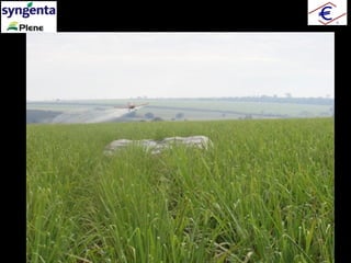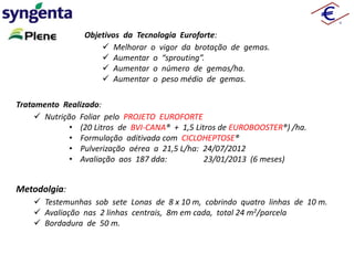 O documento relata os resultados de um estudo que avaliou os efeitos da aplicação foliar de Euroforte em cana-de-açúcar. Os principais resultados foram aumentos de 22,5-21,6% na população de plantas, de 9,1-10,1% no peso de colmos e de 112,5-176,2% no número de gemas por cana.