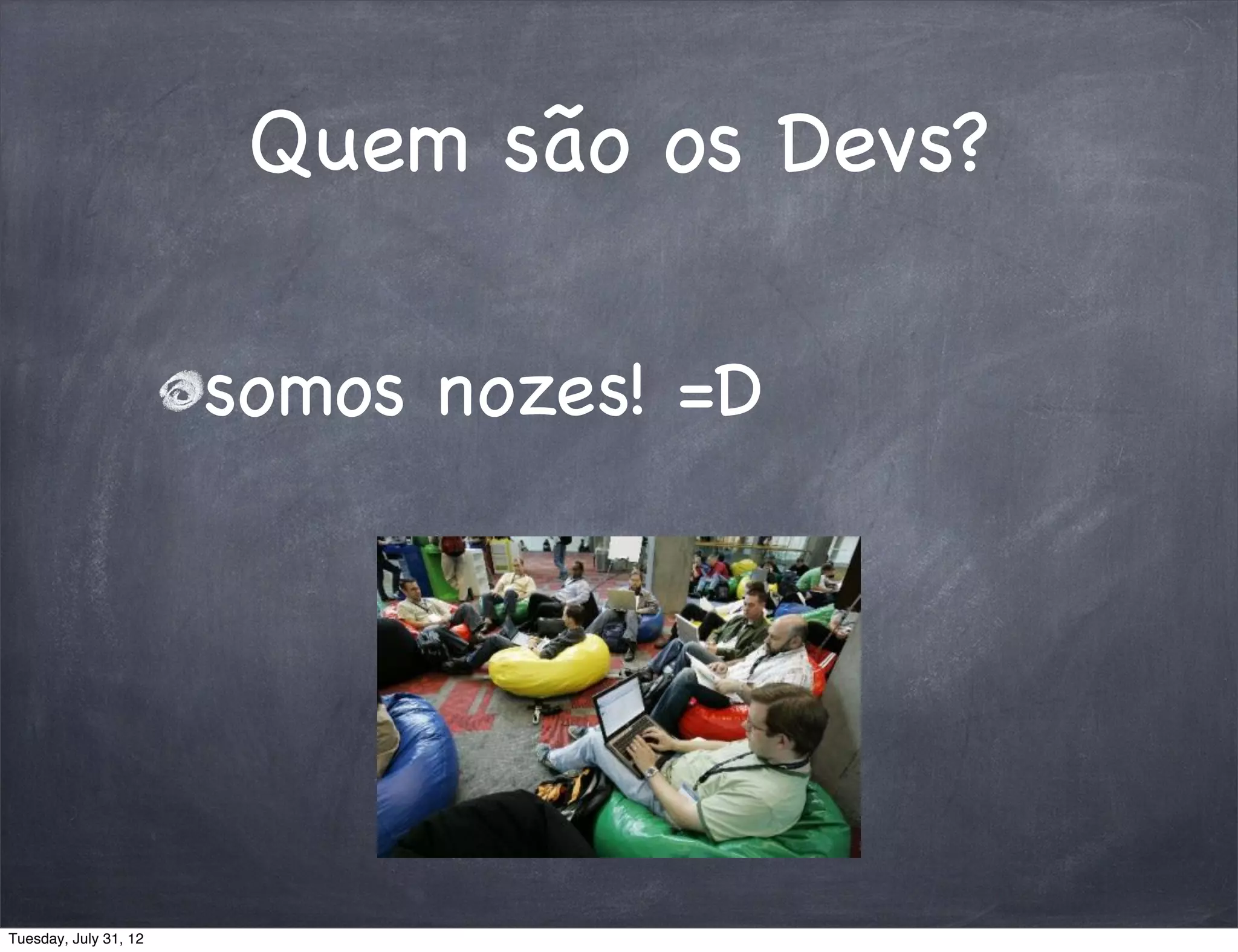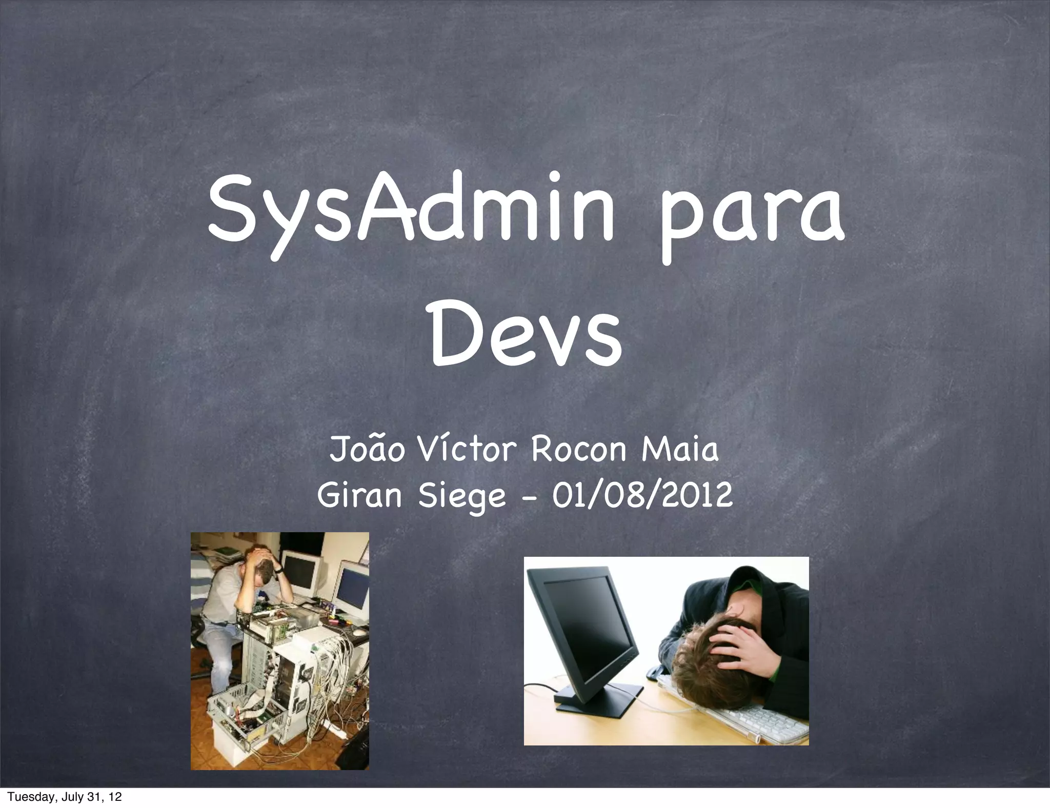O documento discute os papéis e responsabilidades de administradores de sistemas (sysadmins) para desenvolvedores (devs). Sysadmins são responsáveis por criar e manter a infraestrutura como cabos, servidores e redes que permitem que os devs trabalhem. Eles configuram serviços como firewalls, DNS e email e gerenciam conceitos como shells, trabalhar remotamente e segurança.