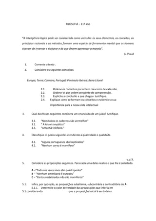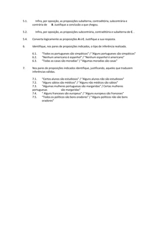 O documento discute conceitos filosóficos como inteligência lógica, conceitos e juízos. Pede para ordenar conceitos geográficos por extensão e compreensão e identificar enunciados de juízos. Também solicita inferir proposições opostas e identificar tipos de inferência entre proposições.
