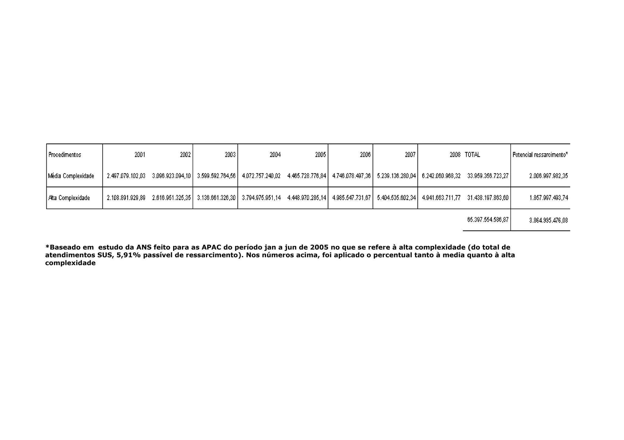 1) O relatório de auditoria realizado na ANS avaliou o sistema de ressarcimento do SUS pelos planos de saúde, constatando que os procedimentos ambulatoriais de alto custo não são ressarcidos, contrariando a lei. 2) Foi estimado um potencial de ressarcimento de R$2,6 bilhões se consideradas as APAC de média e alta complexidade dos anos de 2003 a 2007. 3) Foram identificados gargalos que alongam o processo de ressarcimento, beneficiando as operadoras, como prazos excessivos para análise e