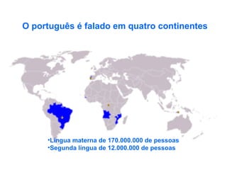 O português é falado em quatro continentes por mais de 182 milhões de pessoas e é a língua oficial de nove países membros da Comunidade dos Países de Língua Portuguesa, fundada em 1996 para promover a cooperação e intercâmbio cultural entre os países lusófonos.