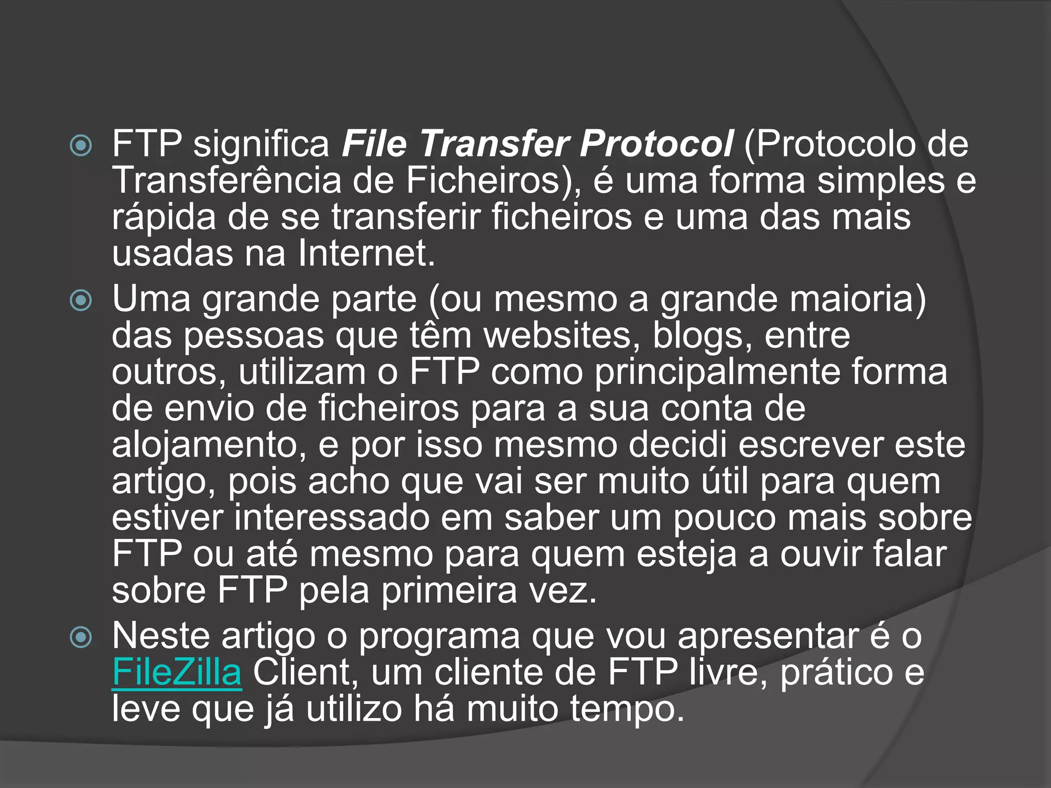 O documento explica o que é FTP (File Transfer Protocol), como transferir ficheiros entre um computador cliente e um servidor usando o programa FileZilla Client. Descreve os passos para configurar uma conta no FileZilla Client, incluindo inserir o endereço do servidor, nome de utilizador e palavra-passe, e como fazer upload e download de ficheiros entre o computador e o servidor.