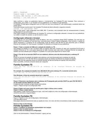 Este documento fornece instruções para configurar o dispositivo Cyclades-TS utilizando quatro métodos: console, browser, telnet ou CLI. Ele descreve os passos para configuração inicial do dispositivo usando o método do console ou browser, incluindo como definir parâmetros básicos como IP e senha.