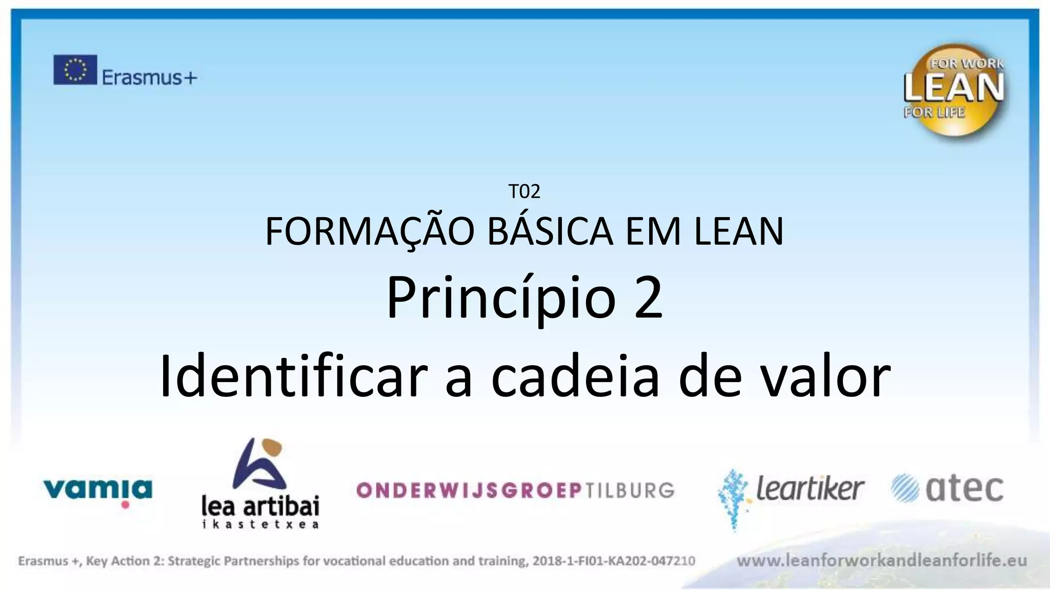 O documento discute princípios fundamentais de Lean, incluindo identificar a cadeia de valor através de mapeamento de processos e Value Stream Mapping, e calcular o Takt Time para equilibrar a produção com a demanda do cliente.