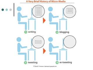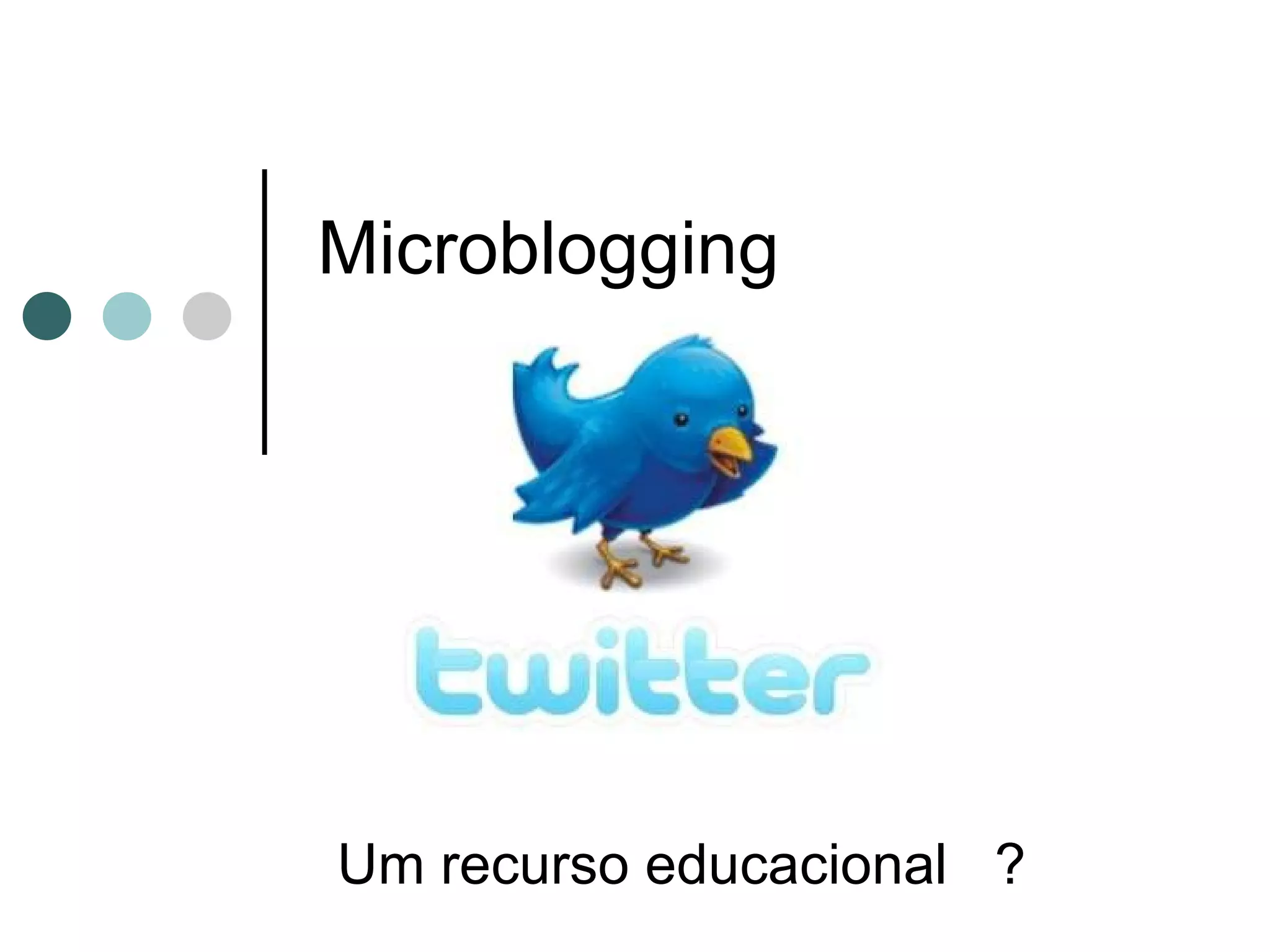 O documento apresenta o Twitter como uma ferramenta de microblogging que pode ser usada para fins pessoais e educacionais. Discutem-se conceitos como Web 2.0, blogs e comunidades virtuais e apresentam-se exemplos de como o Twitter pode ser usado em sala de aula, como troca de informações, pesquisa e aprendizagem colaborativa.