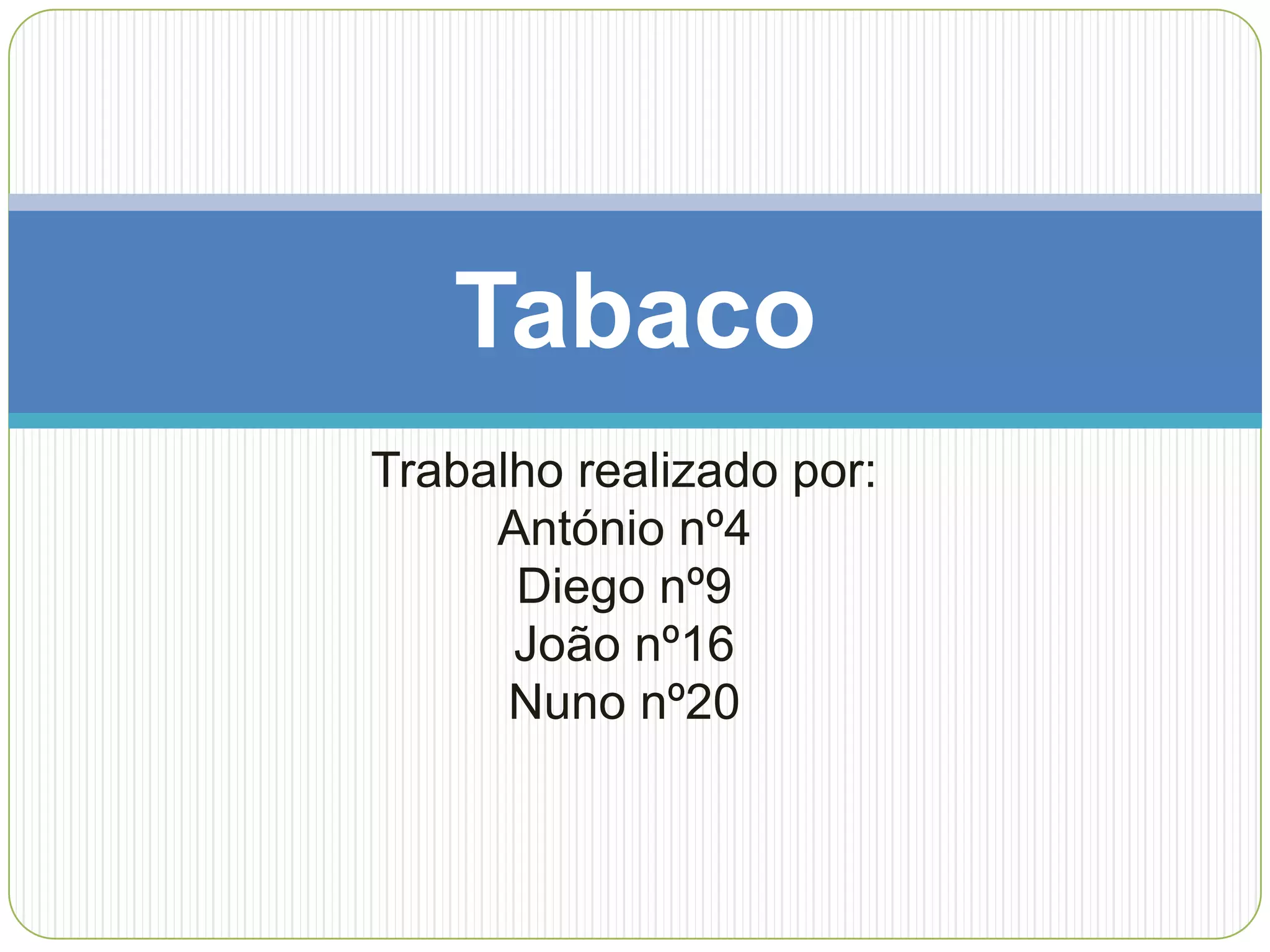 O documento discute o tabaco, incluindo o que é tabaco, por que as pessoas fumam e as consequências do fumo. Ele também fornece imagens anti-tabaco e dicas sobre como parar de fumar, como fixar uma data para parar, obter apoio de outras pessoas e substituir hábitos de fumar.