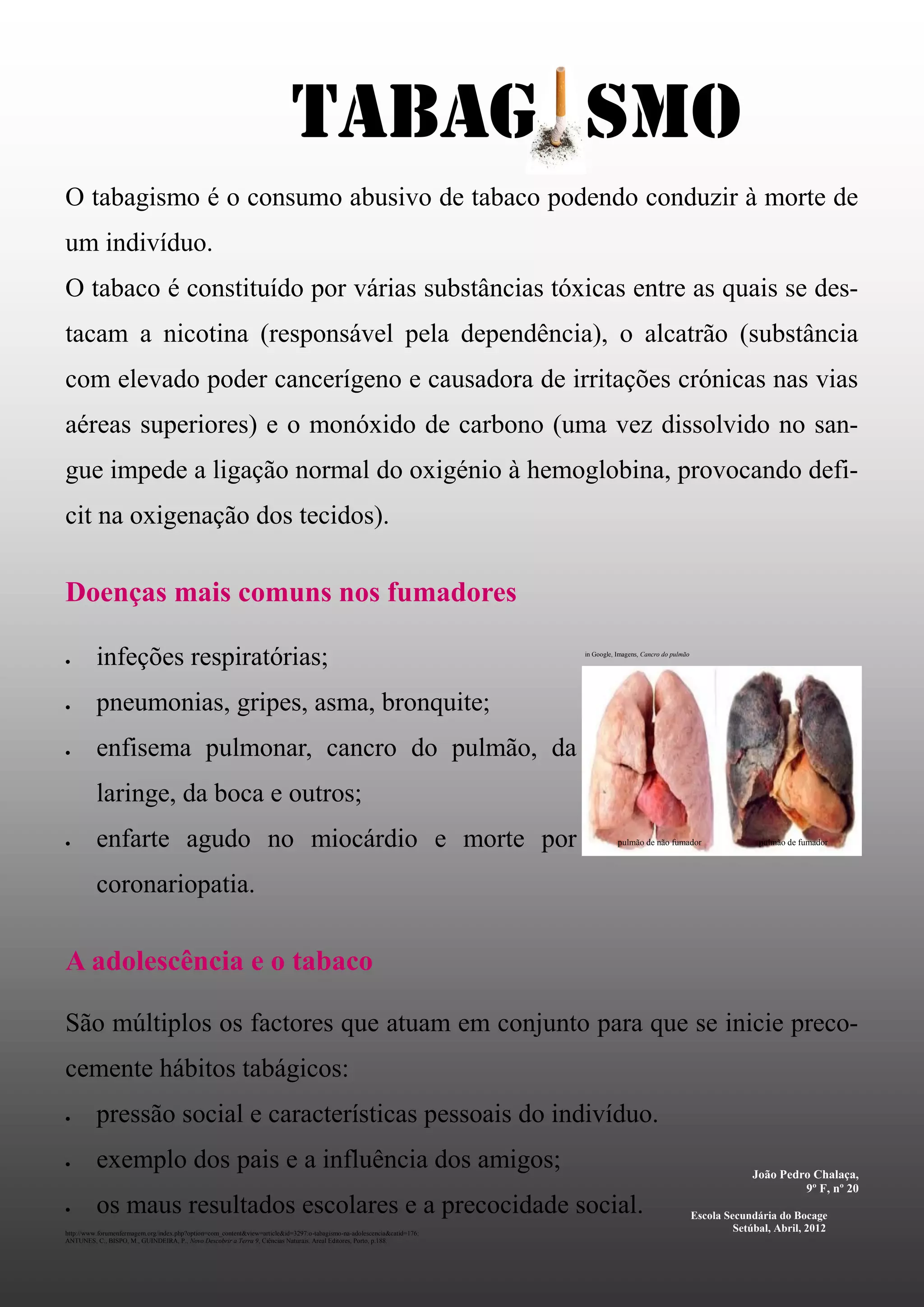 O tabagismo é o consumo abusivo de tabaco e pode levar à morte. O tabaco contém nicotina, alcatrão e monóxido de carbono, substâncias tóxicas e cancerígenas. Os fumadores frequentemente desenvolvem doenças respiratórias, como pneumonia e enfisema, e câncer de pulmão. A adolescência é uma idade de risco para o vício em tabaco devido à pressão social e características pessoais.