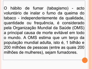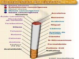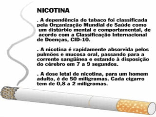 O tabaco é uma planta da família nicotínico com mais de 50 espécies. O fumo do tabaco causa irritação nos pulmões e vias respiratórias, levando a inflamação e redução da capacidade pulmonar, e está relacionado ao câncer de pulmão. O controle do tabagismo inclui prevenção, eliminação da exposição involuntária ao fumo, e programas de abandono do hábito de fumar.