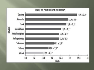 O documento discute três tópicos: tabaco, álcool e drogas. Ele fornece detalhes sobre os componentes do tabaco e sua história, o consumo excessivo de álcool em Portugal, e as categorias principais de drogas, incluindo suas propriedades.