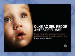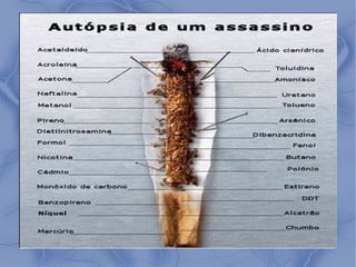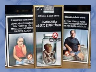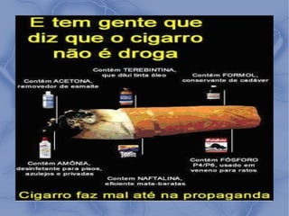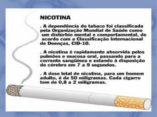 O documento discute os riscos do tabagismo para a saúde, destacando: 1) A indústria do tabaco vende nicotina, uma droga viciante; 2) A nicotina causa dependência física e é a principal responsável pela pandemia do tabagismo; 3) O tabagismo é a principal causa evitável de doença e morte no mundo.