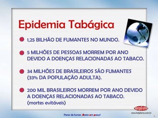 O documento discute as medidas para combater o tabagismo, incluindo: 1) Estatísticas alarmantes sobre o número de fumantes e mortes relacionadas ao tabaco no mundo e no Brasil; 2) Medidas políticas para restringir o acesso de menores e proibição de fumar em locais públicos; 3) Principais doenças relacionadas ao fumo como câncer e doenças cardíacas.
