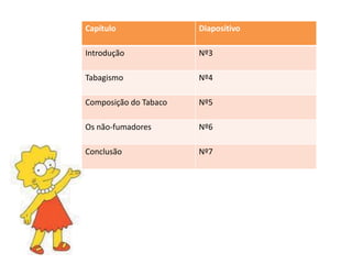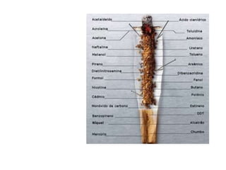 Este documento apresenta um resumo sobre os malefícios do tabagismo. Ele discute como o tabaco contém mais de 4 mil compostos químicos tóxicos, dos quais 40 são cancerígenos, e como o tabagismo causa cerca de 4,9 milhões de mortes por ano. Também destaca que o tabagismo passivo também prejudica a saúde de não-fumadores e que estudos mostram a associação entre tabagismo e um terço de todos os casos de câncer e 90% dos casos de câncer de pulm