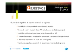 Este estudo português sobre tabagismo de 2012 teve uma amostra de 1002 pessoas. A prevalência geral de fumadores foi de 22,2%, sendo maior nos homens do que nas mulheres. A motivação principal para deixar de fumar citada por fumadores foi a saúde, seguida do preço do tabaco. No entanto, os fumadores parecem pouco motivados para deixar de fumar e expõem-se frequentemente ao fumo passivo em casa e no carro.