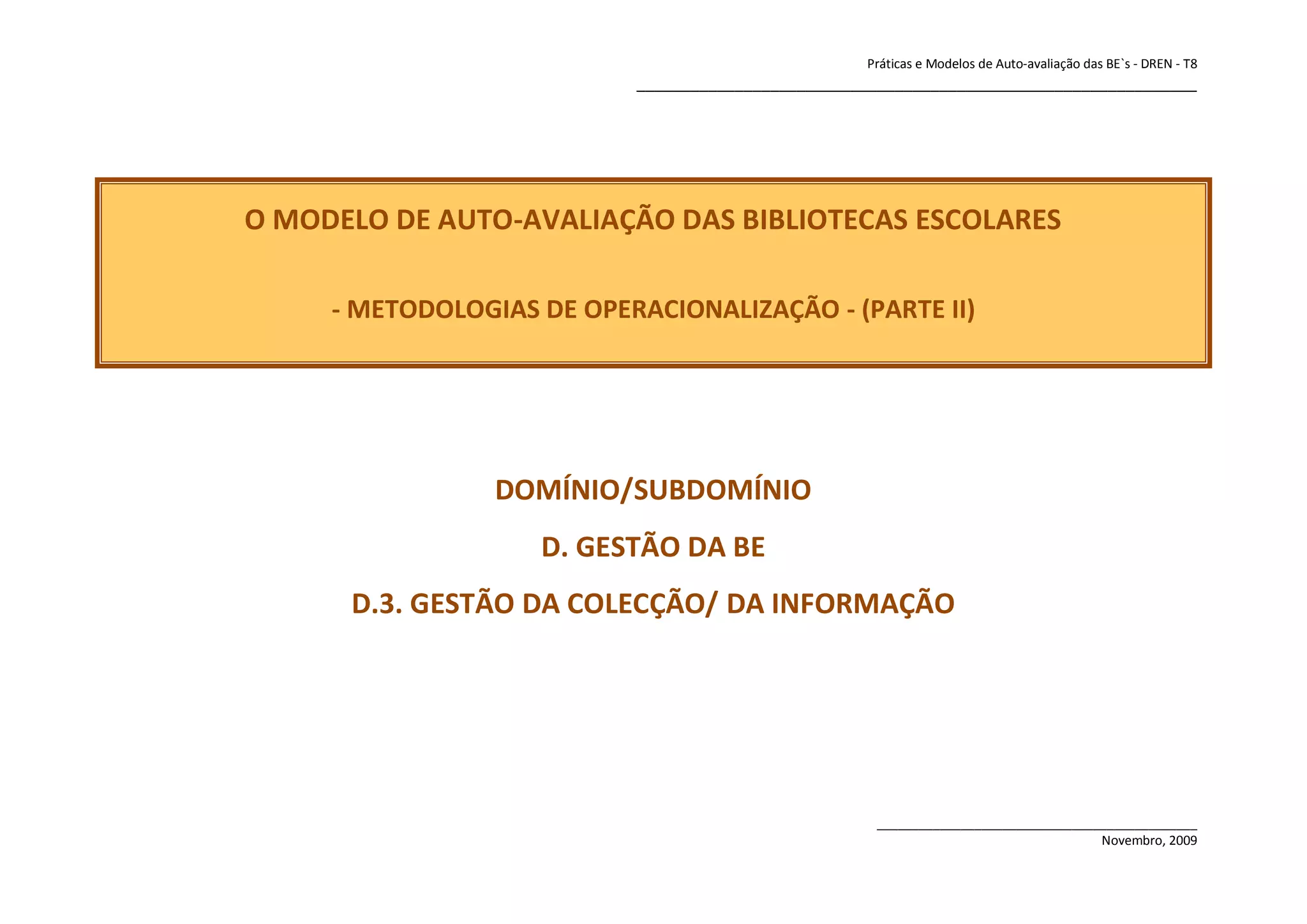 Este documento fornece indicadores e fatores críticos para a autoavaliação de bibliotecas escolares no domínio da gestão da coleção e da informação. Apresenta instrumentos para recolher evidências sobre planeamento da coleção, adequação aos utilizadores, uso e organização da informação. O objetivo é apoiar bibliotecas na avaliação contínua e melhoria destas áreas.