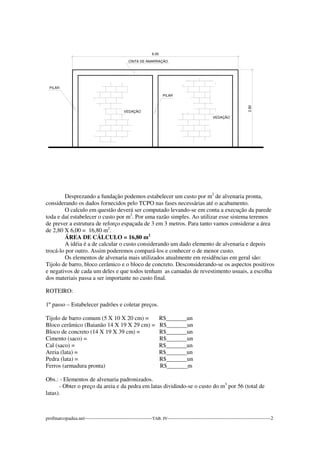 1) O documento analisa os custos de três elementos de alvenaria - tijolo de barro, bloco cerâmico e bloco de concreto - para determinar qual é o mais econômico.