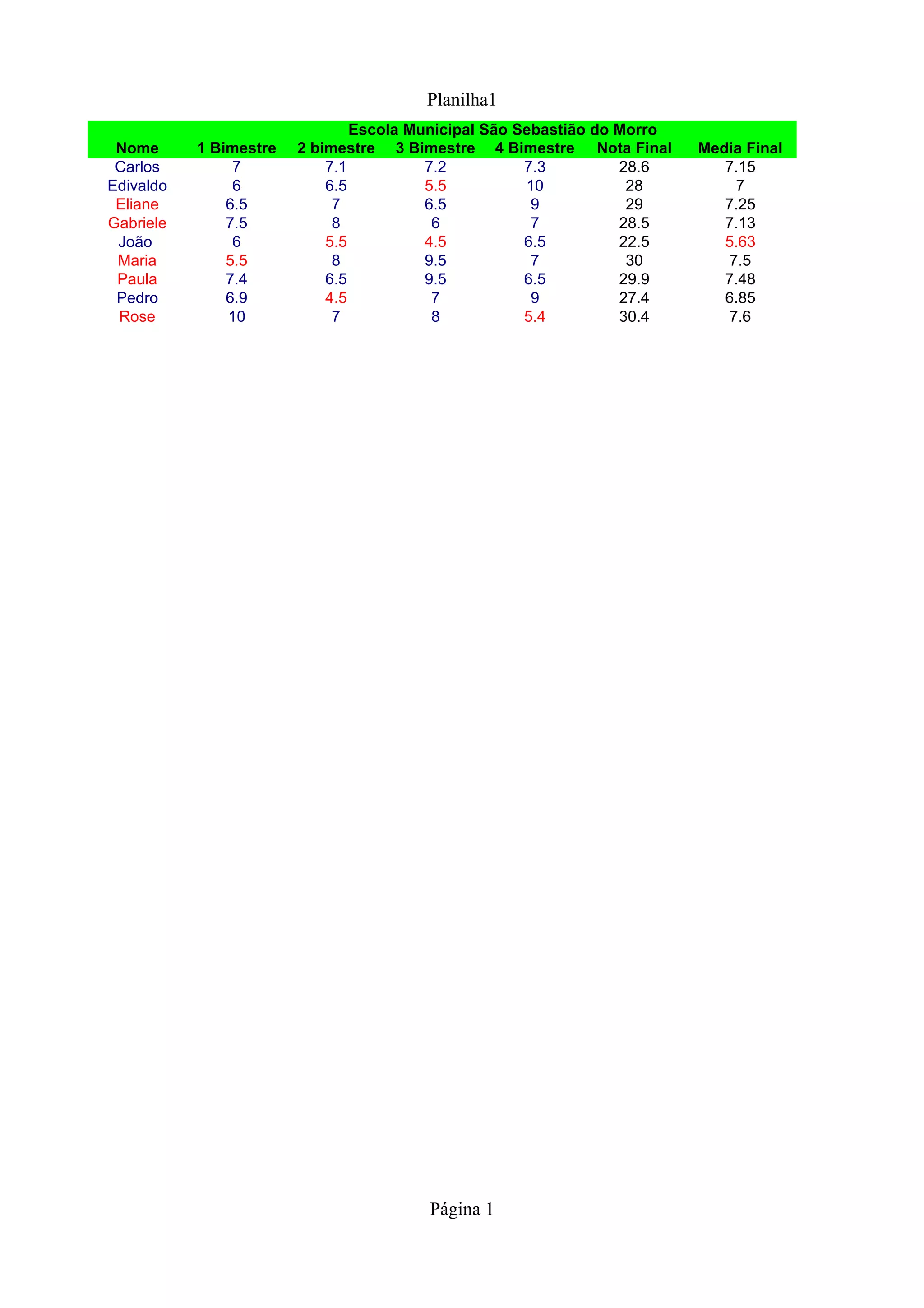 Planilha1 Escola Municipal São Sebastião do Morro Nome 1 Bimestre 2 bimestre 3 Bimestre 4 Bimestre Nota Final Media Final Carlos 7 7.1 7.2 7.3 28.6 7.15 Edivaldo 6 6.5 5.5 10 28 7 Eliane 6.5 7 6.5 9 29 7.25 Gabriele 7.5 8 6 7 28.5 7.13 João 6 5.5 4.5 6.5 22.5 5.63 Maria 5.5 8 9.5 7 30 7.5 Paula 7.4 6.5 9.5 6.5 29.9 7.48 Pedro 6.9 4.5 7 9 27.4 6.85 Rose 10 7 8 5.4 30.4 7.6 Página 1