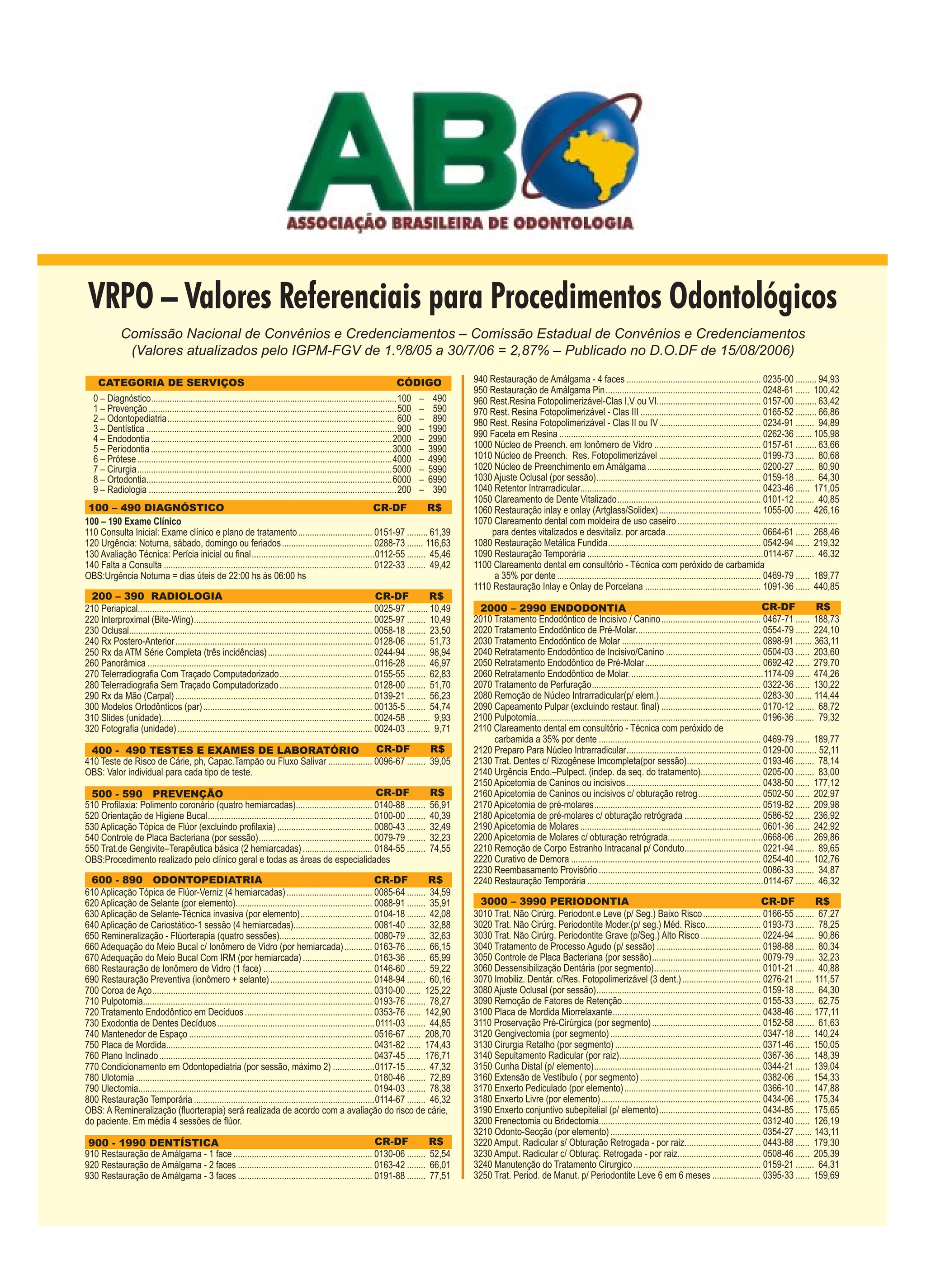 Este documento apresenta valores de referência para procedimentos odontológicos realizados no Distrito Federal, Brasil. Está organizado em categorias como diagnóstico, prevenção, odontopediatria, dentística, endodontia, periodontia, prótese, cirurgia, ortodontia e radiologia, com códigos e valores para cada procedimento. São listados valores para mais de 100 procedimentos como restaurações, tratamentos endodônticos, cirurgias periodontais e próteses dentárias.