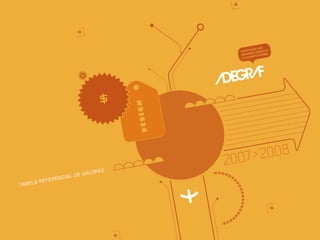 O documento apresenta uma tabela com valores de referência para serviços de design gráfico, como identidade visual, marcas, papelaria, ilustração, sinalização, editorial e promocional. A tabela traz valores para micro, pequena, média e grande empresas e lista os itens incluídos em cada serviço.