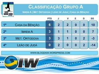 O documento apresenta os resultados dos jogos de 6 grupos de um campeonato de futebol entre igrejas. Cada grupo tinha 4 equipes que jogaram entre si. A tabela classificatória de cada grupo lista as equipes de acordo com sua pontuação, vitórias, empates e saldo de gols.
