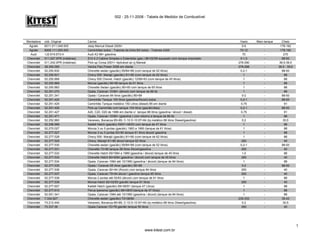 O documento fornece tabelas com os níveis de combustível em litros para vários modelos de veículos de diferentes montadoras. A tabela lista o nível quando o tanque está vazio, meio cheio e cheio. Fornece também códigos originais e anos dos modelos dos veículos.