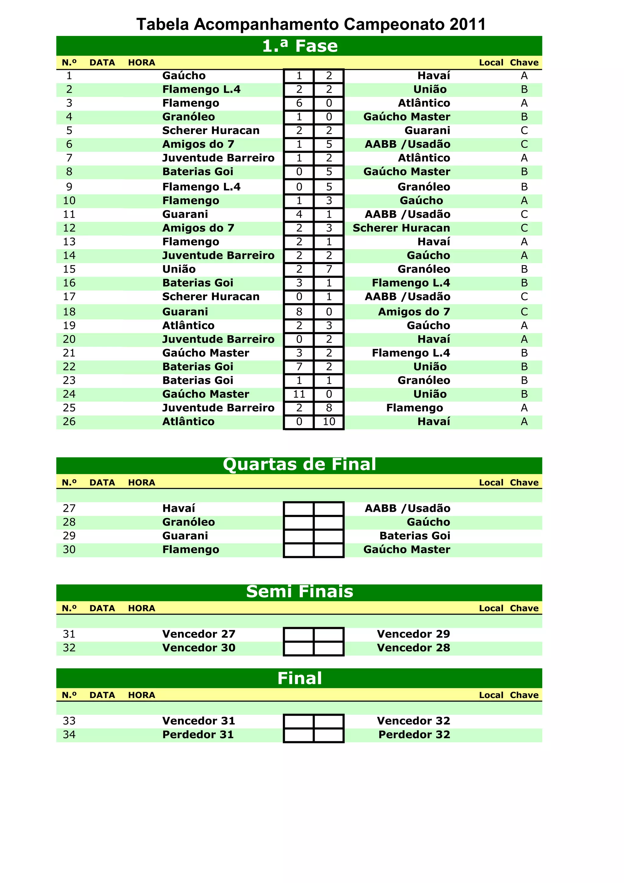 1) O documento apresenta os resultados da 1a fase do Campeonato de 2011 dividido em grupos A, B e C.