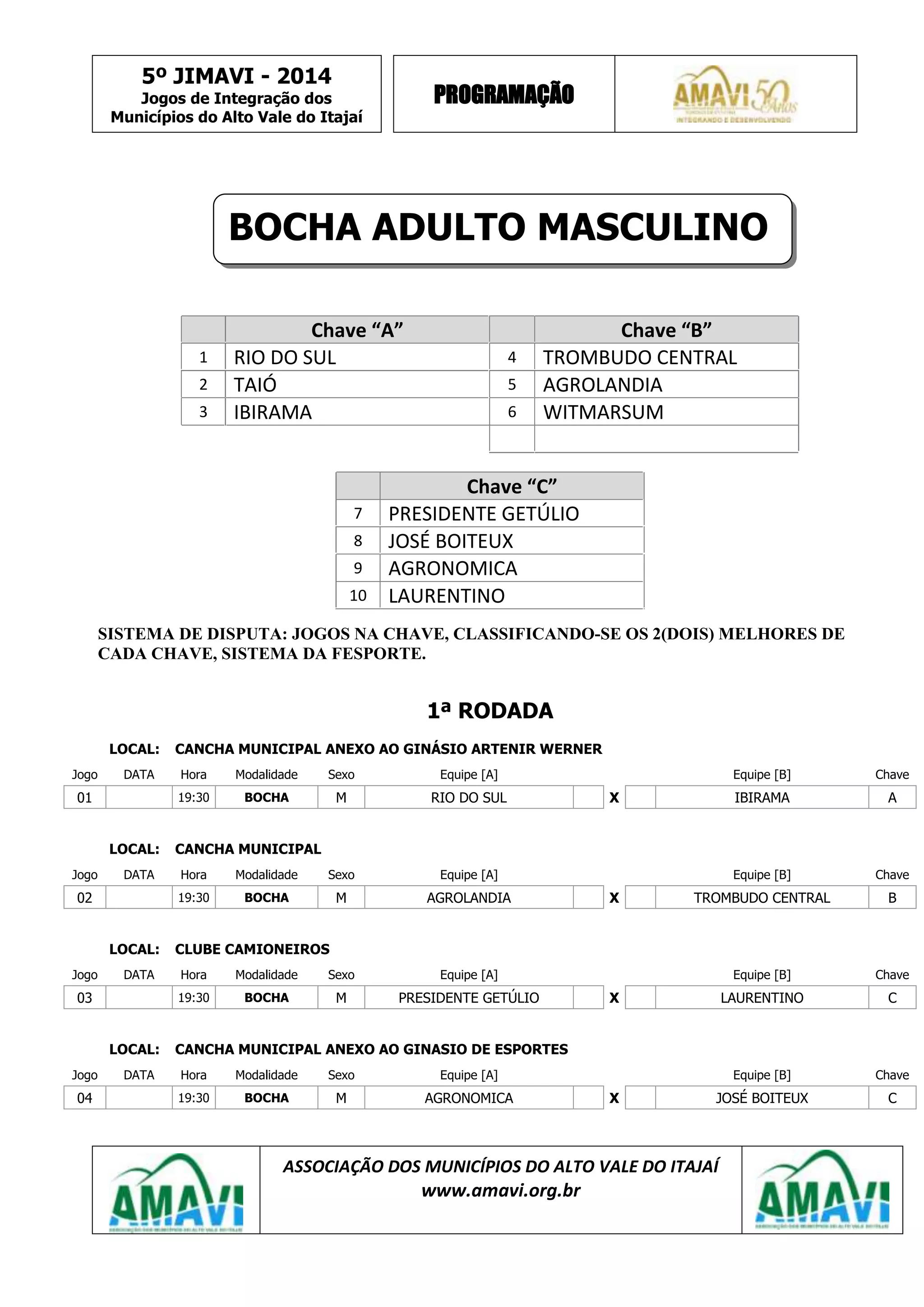 Este documento apresenta a programação do 5o JIMAVI (Jogos de Integração dos Municípios do Alto Vale do Itajaí) de 2014, incluindo as modalidades de bocha masculina e feminina em diferentes categorias, futebol feminino e futebol masculino sub-14. A competição ocorrerá em vários municípios entre os dias 04 e 10 de maio e contará com a participação de equipes de 10 municípios da região.