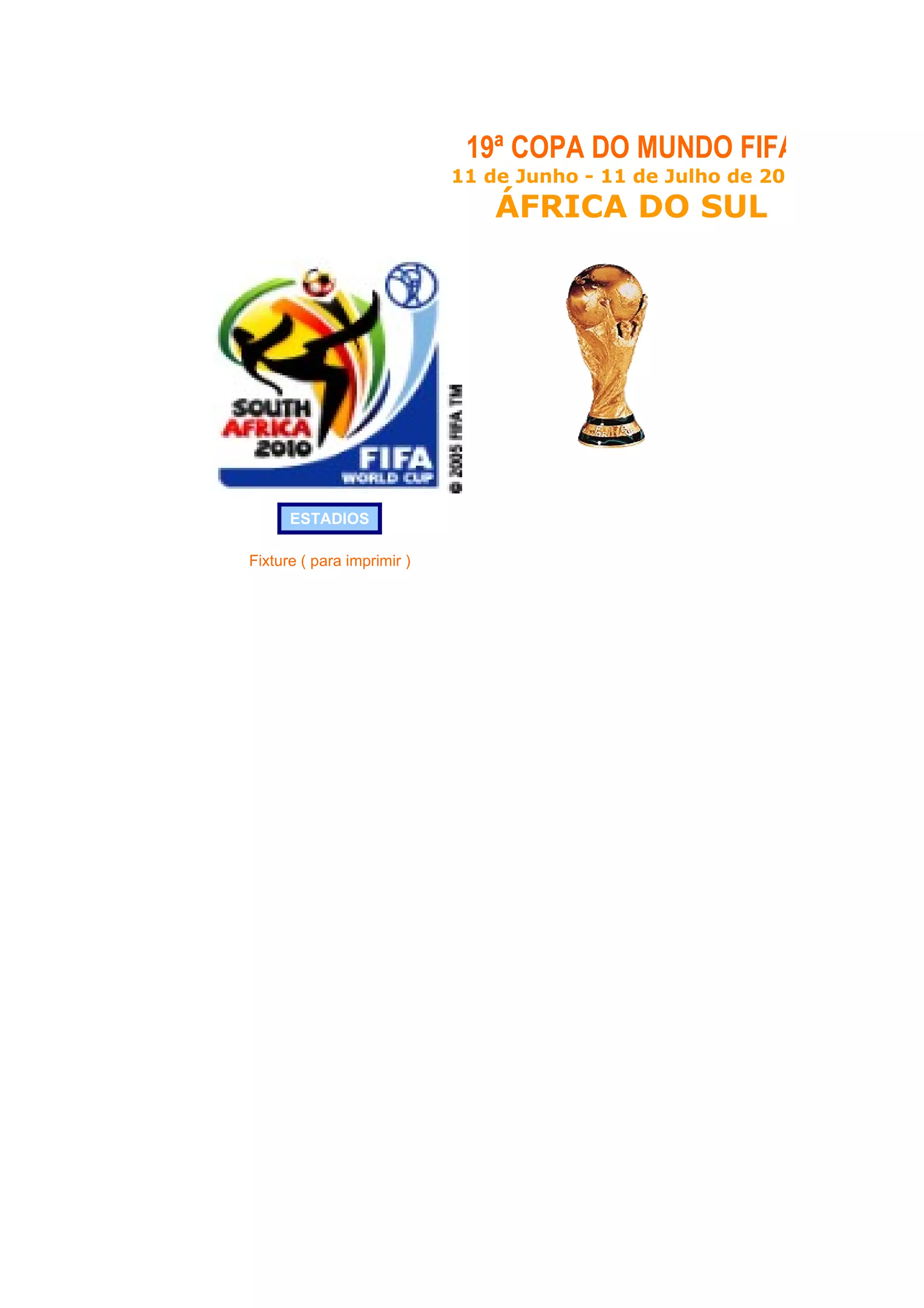Este documento fornece informações sobre os estádios e a primeira fase da Copa do Mundo FIFA de 2010 na África do Sul. Ele lista os estádios que sediaram jogos e fornece o cronograma completo de partidas dos grupos A-D, incluindo datas, locais e times participantes.