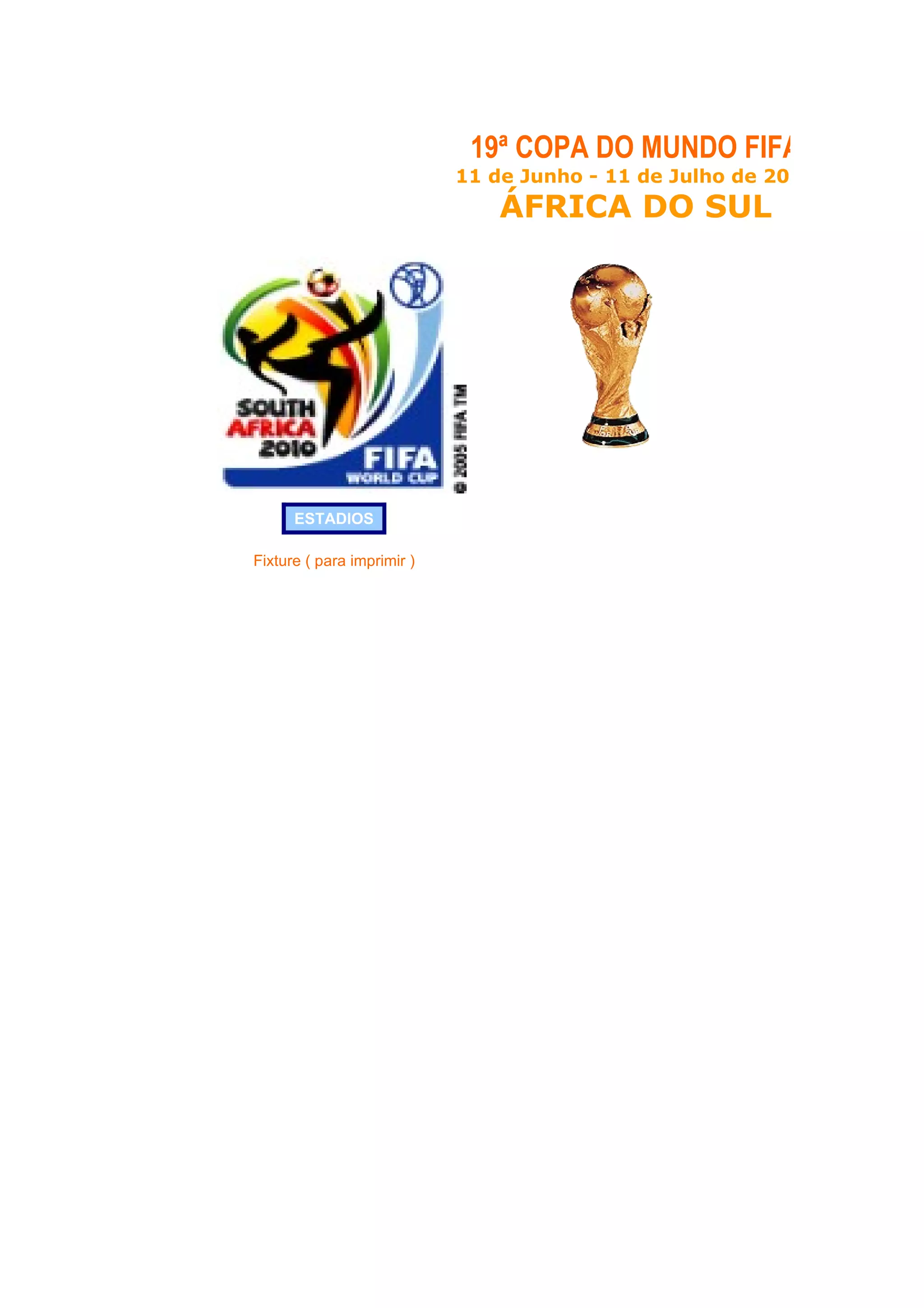 Este documento fornece informações sobre os estádios e a programação da primeira fase da Copa do Mundo da FIFA de 2010, que foi sediada na África do Sul. Ele lista os grupos e as datas e locais dos jogos de cada time nesta fase inicial do torneio.