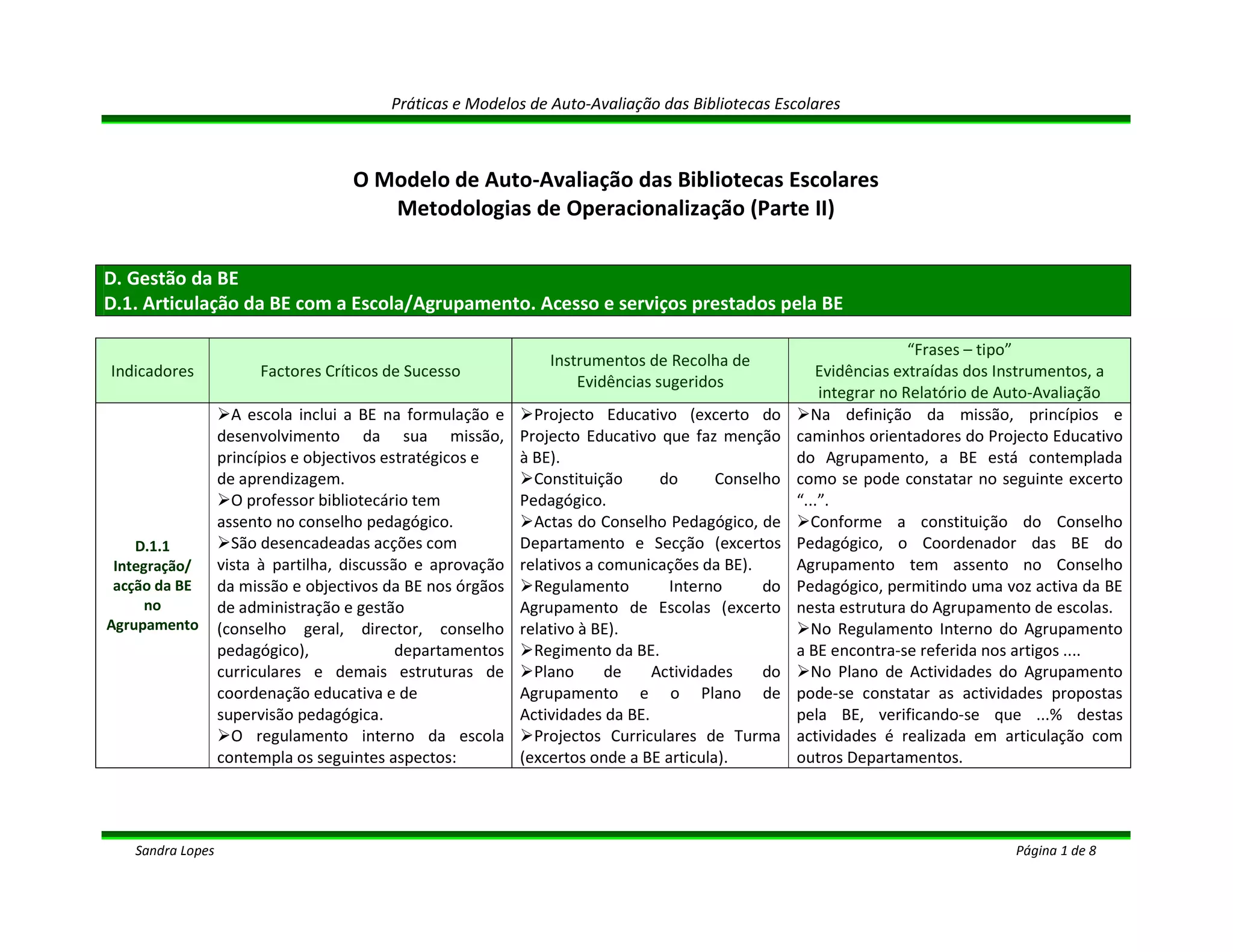 Este documento descreve o modelo de autoavaliação para bibliotecas escolares, abordando a gestão da biblioteca no agrupamento escolar. Apresenta indicadores e fatores críticos de sucesso para avaliar a integração da biblioteca na escola, a valorização da biblioteca pelos órgãos de gestão, e a resposta da biblioteca às necessidades da comunidade escolar. Também fornece exemplos de instrumentos e evidências para a aplicação do modelo de autoavaliação.