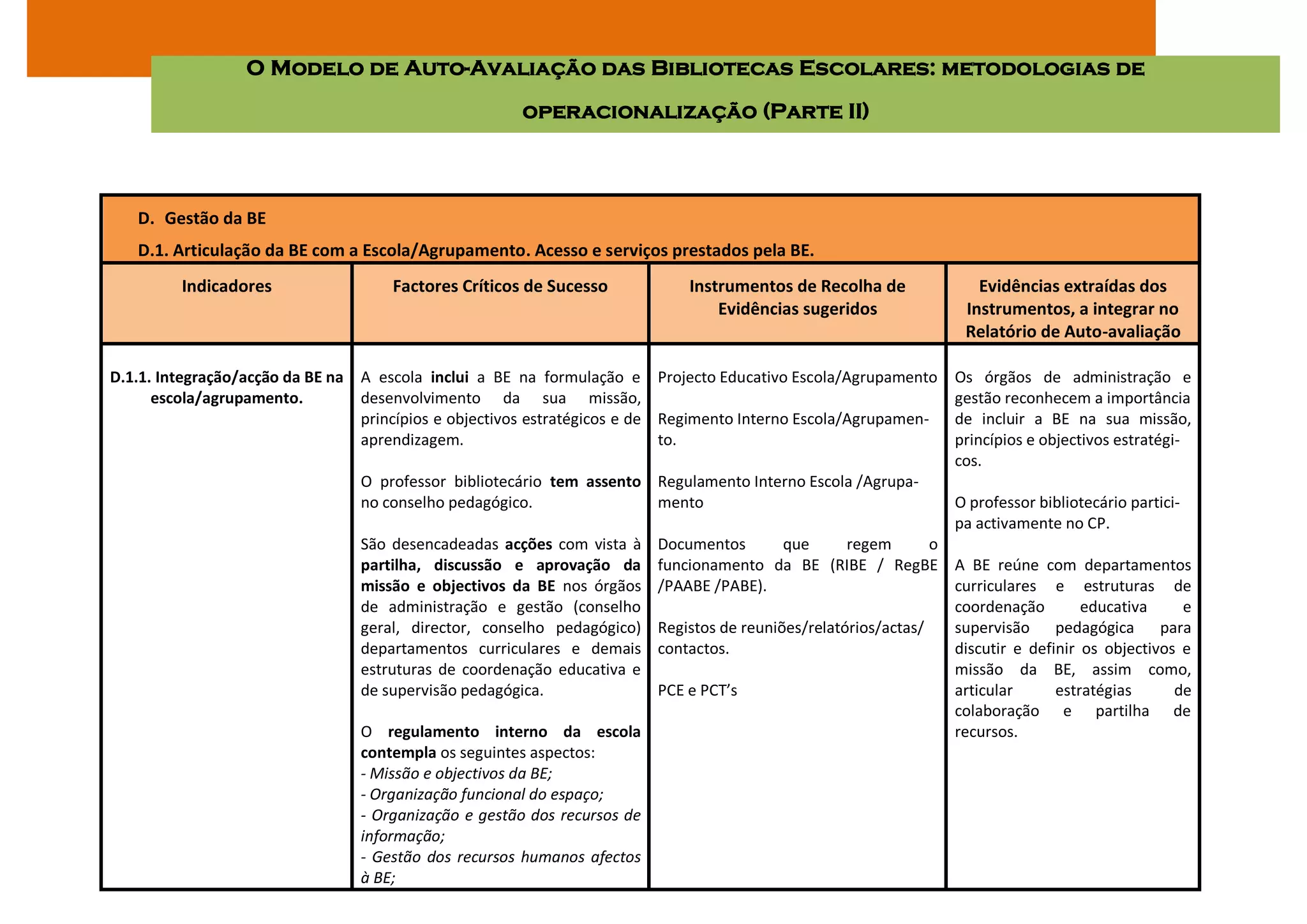 Este documento fornece diretrizes para a autoavaliação de bibliotecas escolares, abordando sua gestão e integração na escola, valorização pelos órgãos administrativos, e capacidade de resposta às necessidades da comunidade escolar. Instrumentos como questionários e registros de atividades são sugeridos para coletar evidências a serem analisadas e usadas para melhorar o desempenho da biblioteca.