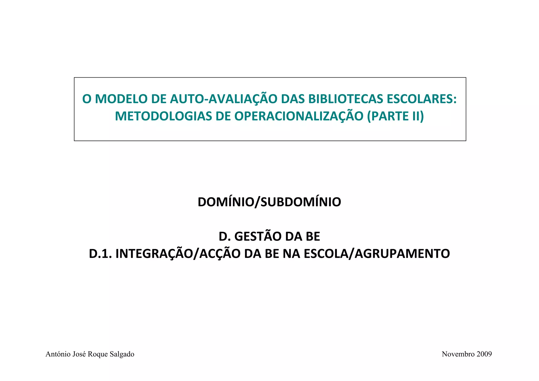 O documento descreve o domínio da gestão da biblioteca escolar (BE) e seu subdomínio da integração da BE na escola/agrupamento. Ele fornece indicadores e fatores críticos de sucesso para avaliar esse subdomínio e sugere instrumentos de coleta de evidências para integrar no modelo de autoavaliação da BE.