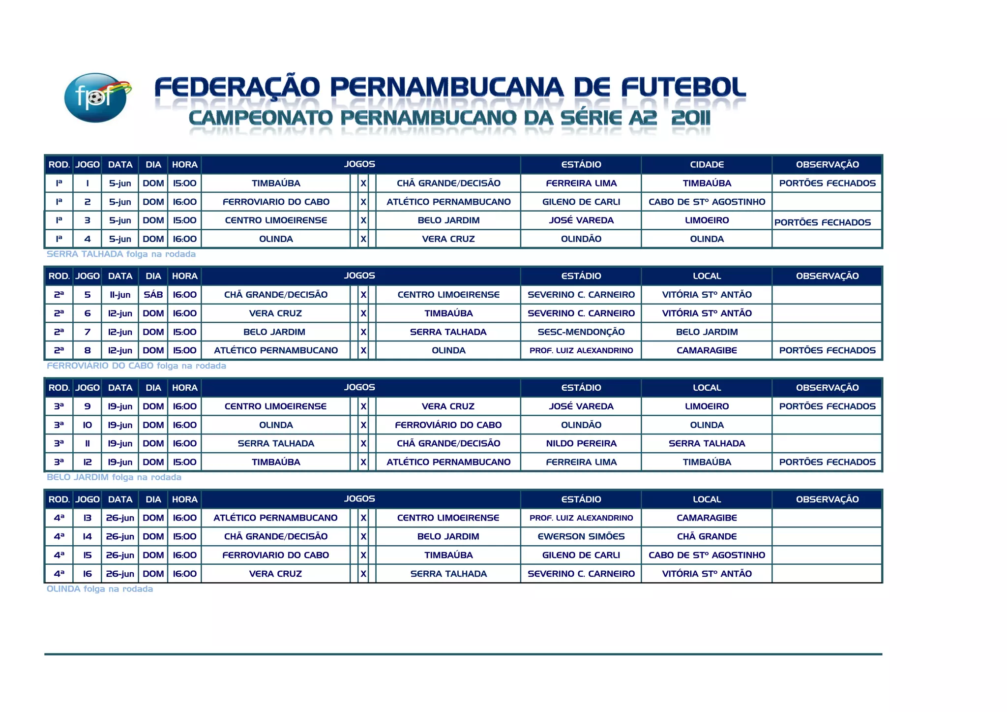 O documento apresenta a programação de nove rodadas de um campeonato de futebol amador com jogos aos finais de semana entre 5 de junho e 31 de julho. A cada rodada são listados o número do jogo, data, dia, horário, times participantes, estádio sede e cidade ou localidade.