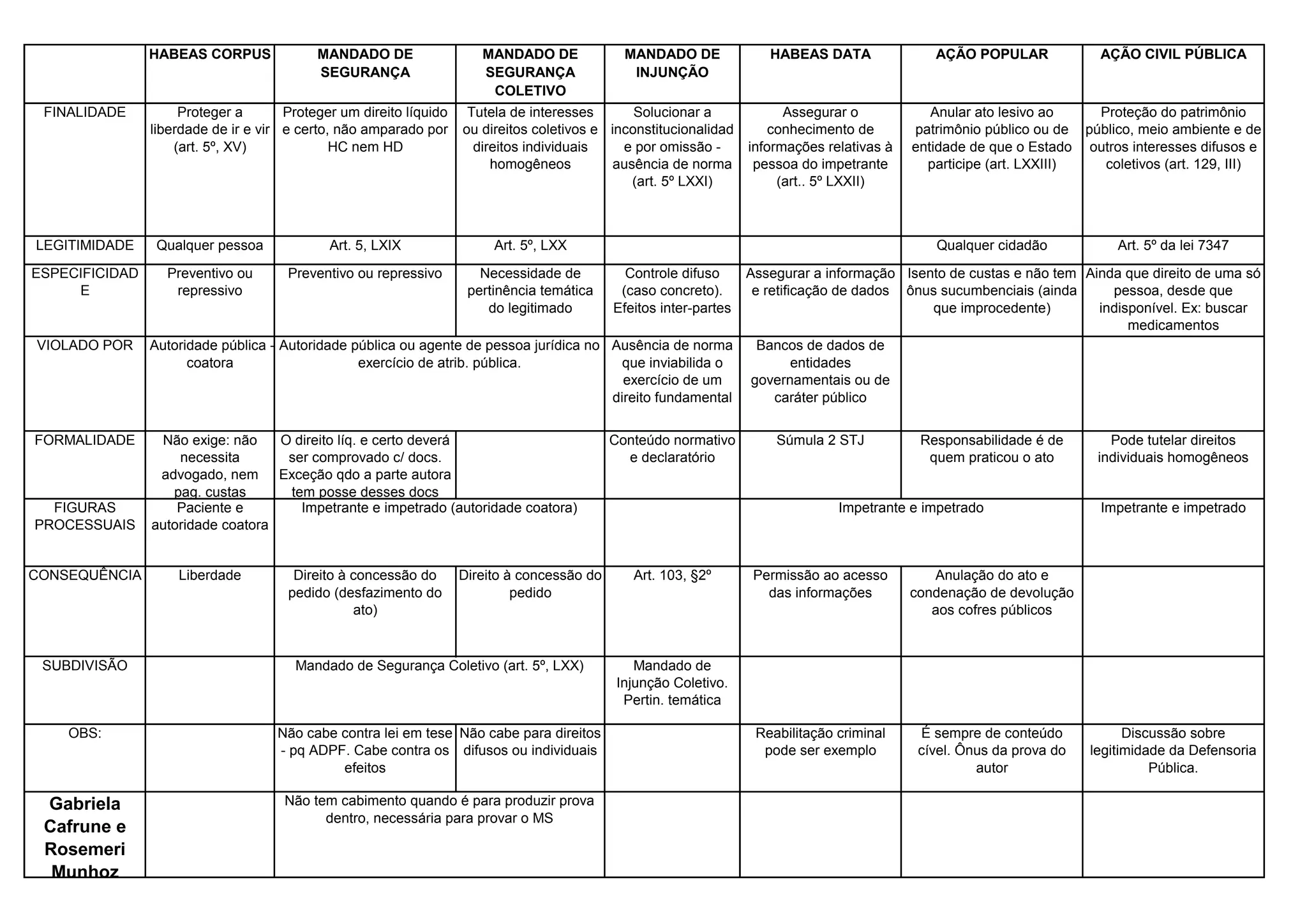 Os instrumentos jurídicos descritos protegem direitos individuais e coletivos como liberdade de ir e vir, acesso a informações pessoais e patrimônio público. Cada um possui legitimidade, formalidades e consequências específicas para garantir esses direitos quando violados por atos de autoridades públicas.