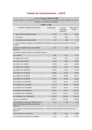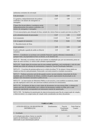 1) A tabela apresenta os emolumentos cobrados por atos notariais e de registro no estado;
