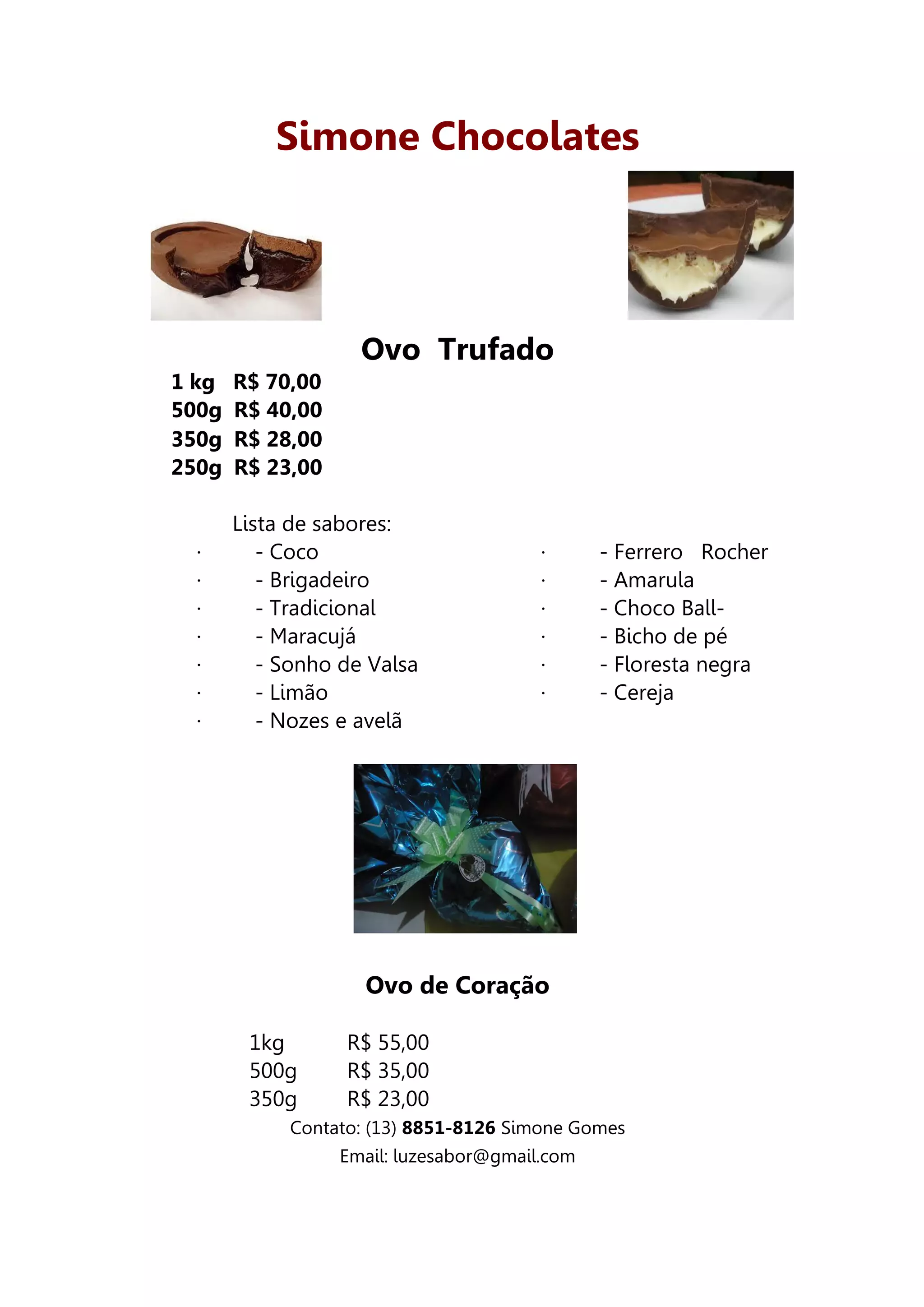 O documento lista os produtos de chocolate oferecidos pela Simone Chocolates, incluindo ovos trufados em vários sabores e tamanhos a partir de R$23,00, ovos de coração de R$23,00 a R$55,00, ovos ao leite liso ou crocante de R$17,00 a R$65,00 e ovos de colher de R$30,00 a R$80,00. Informações de contato também são fornecidas.