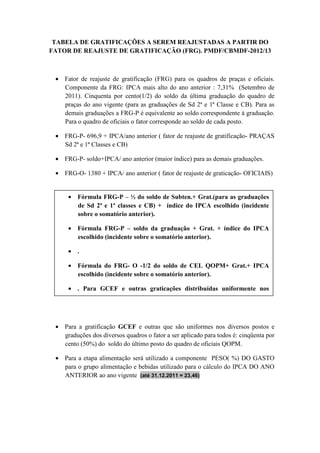 A medida provisória fixa o subsídio dos membros da Polícia Militar do DF e do Corpo de Bombeiros Militar do DF, define verbas indenizatórias e cargos/funções dessas corporações, e altera leis relacionadas. O documento apresenta tabelas com propostas de reajuste de soldos e gratificações dessas corporações, usando o soldo do coronel como fator de cálculo para outros postos e graduações.