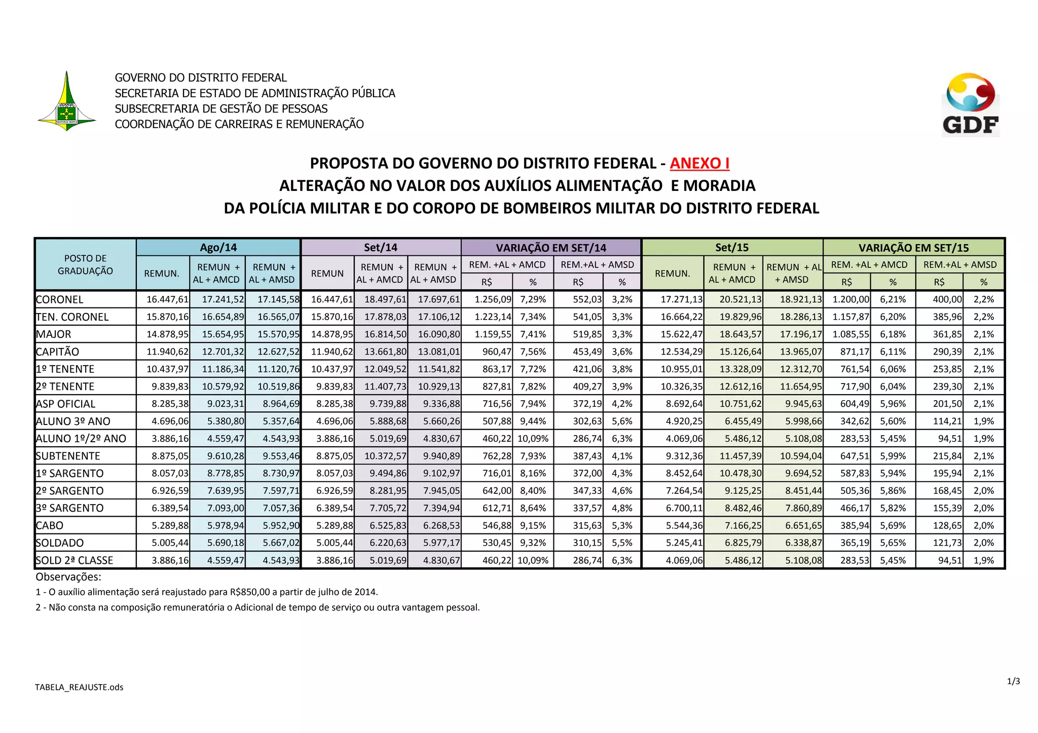 O documento propõe aumentos nos valores dos auxílios alimentação e moradia para a Polícia Militar e Corpo de Bombeiros do Distrito Federal entre 2014 e 2016, variando entre 2% a 8% a cada ano. A tabela detalha as remunerações e benefícios de cada posto nas três datas.