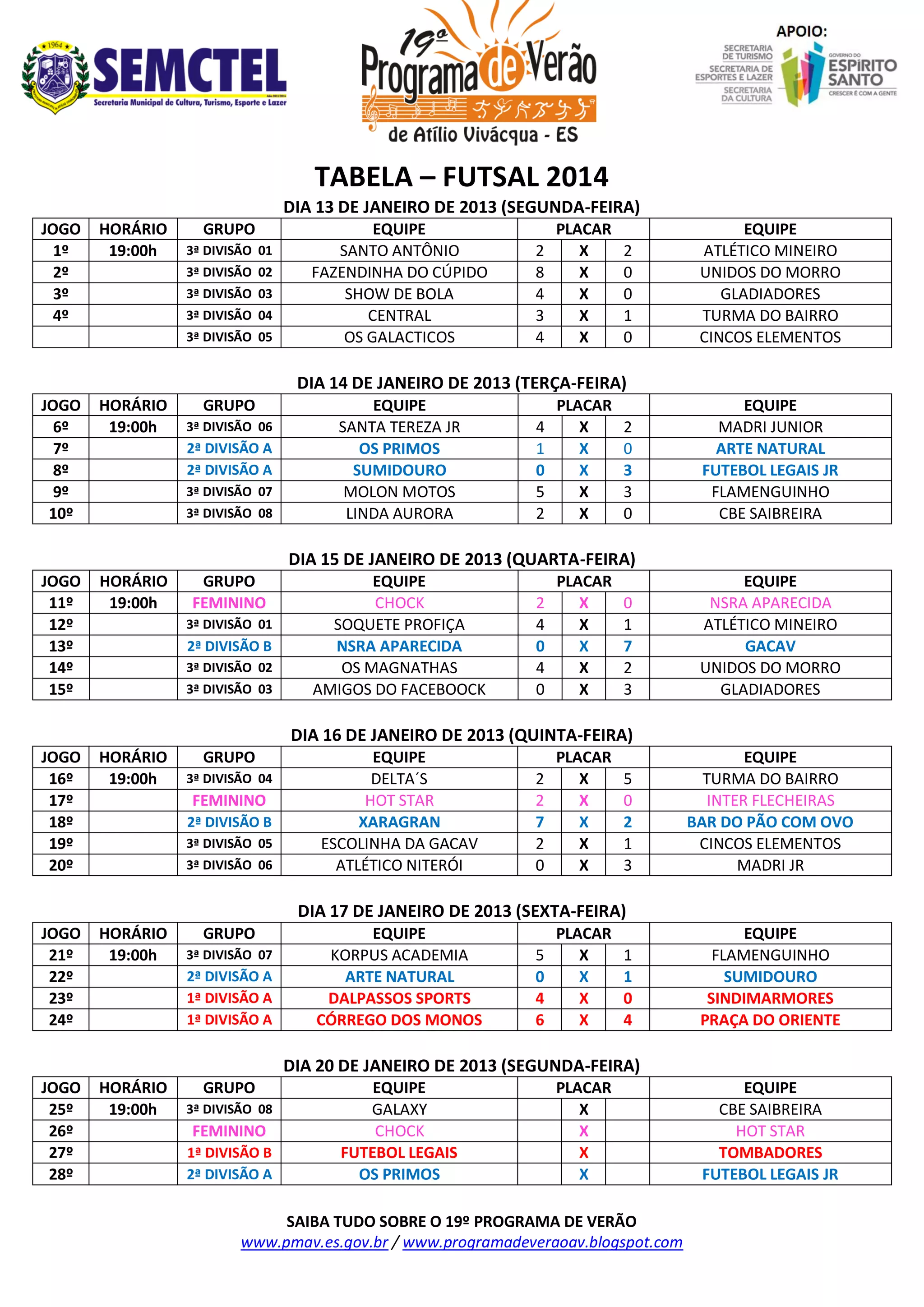 O documento apresenta a tabela de jogos do campeonato de futsal de 2014, com 64 jogos agendados entre 13 e 31 de janeiro distribuídos entre as divisões feminina, 2a, 1a e 3a. Os jogos classificatórios serão seguidos por quartas-de-final, semifinais e finais para definir os campeões de cada divisão.