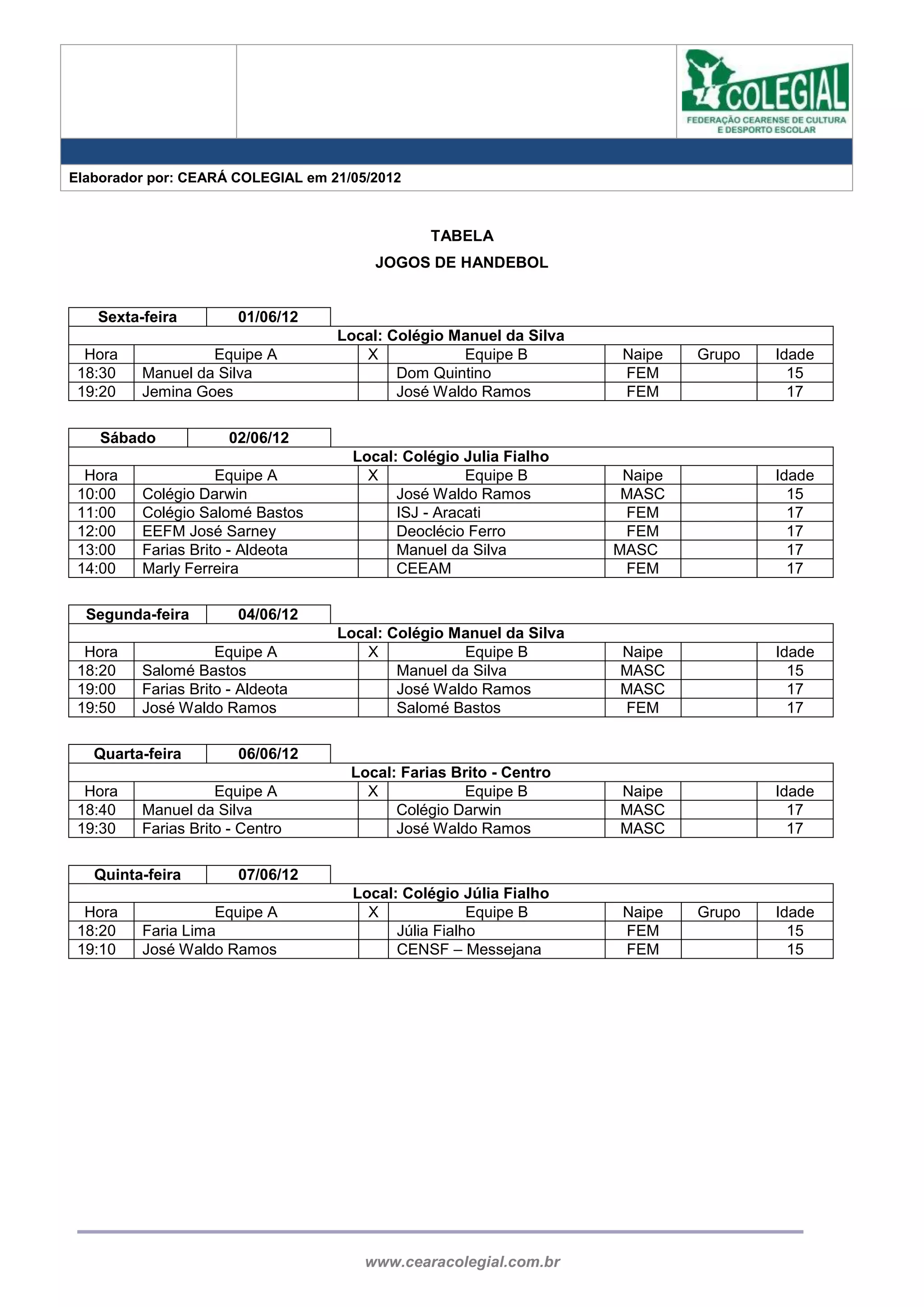 O documento lista os jogos de handebol de diferentes categorias que ocorrerão entre 1 e 7 de junho em vários colégios. Também define as datas e locais das semifinais e finais dos campeonatos sub-17 masculino, sub-15 masculino, sub-17 feminino e sub-15 feminino.