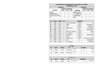 O documento apresenta o cronograma do II Campeonato Quaretao de Futebol de Campo Veterano de 2012. As equipes foram divididas em duas chaves A e B, com 3 rodadas cada. Na segunda fase, os semifinais e final serão realizados entre os primeiros colocados de cada chave.