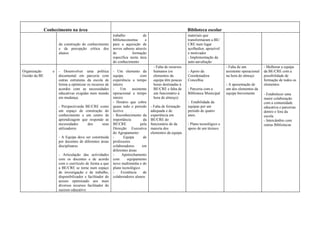 1) O documento apresenta uma tabela para analisar as competências, pontos fortes e desafios de um professor bibliotecário. 2) Identifica como pontos fortes a formação do professor e a permanência na biblioteca por 4 anos, mas aponta fraquezas como a falta de conhecimentos em TIC. 3) Entre os desafios, refere-se a promover o trabalho em parceria com a comunidade escolar e a implementar formação específica na área.